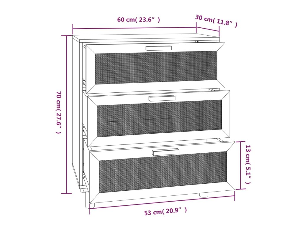 - Dostatok úložného priestoru: Skrinka vybavená 3 zásuvkami ponúka dostatok úložného priestoru na uskladnenie rôznych každodenných potrieb dobre organizovaných a na dosah ruky. Navyše dizajn prírodného ratanu dodáva extra krásu.