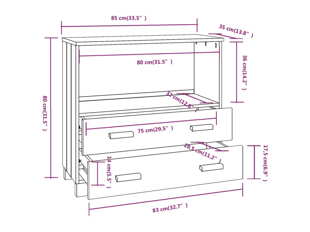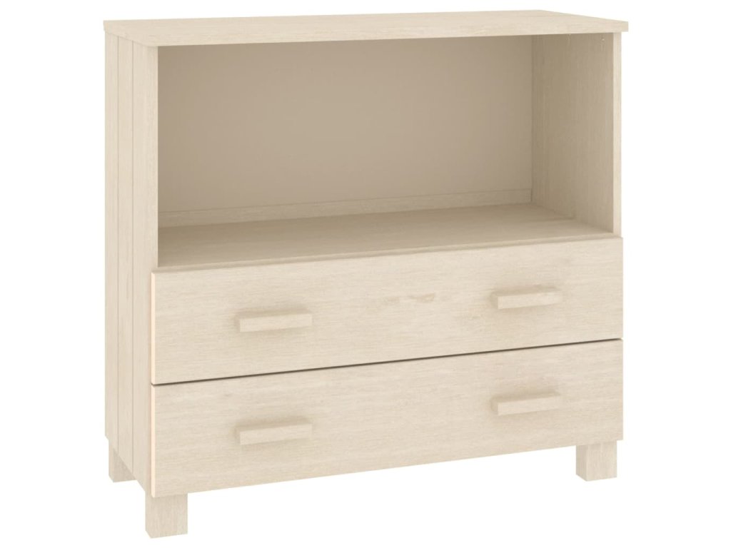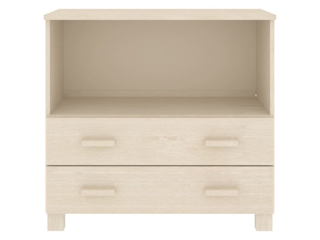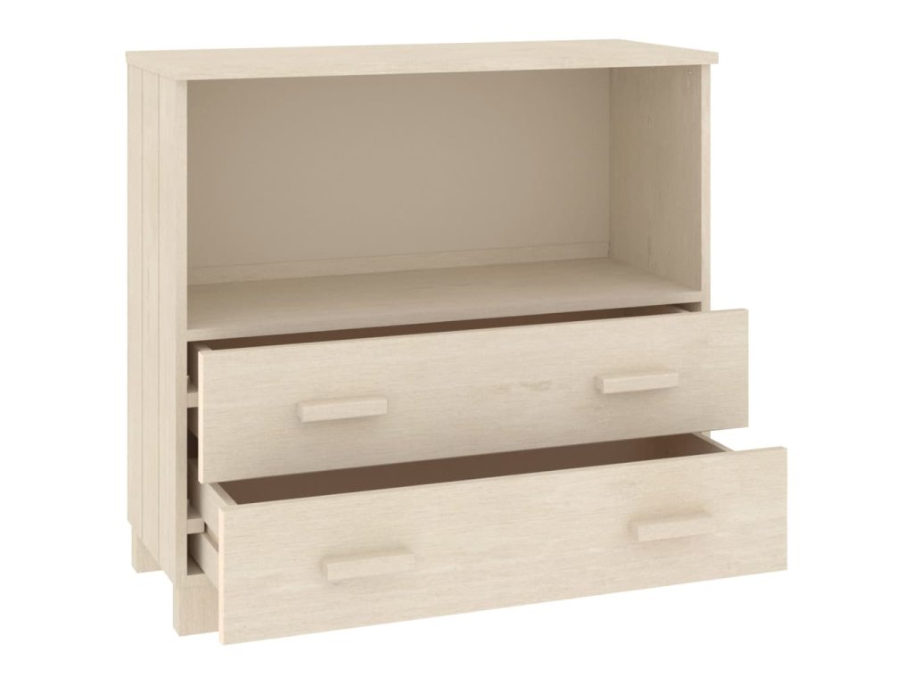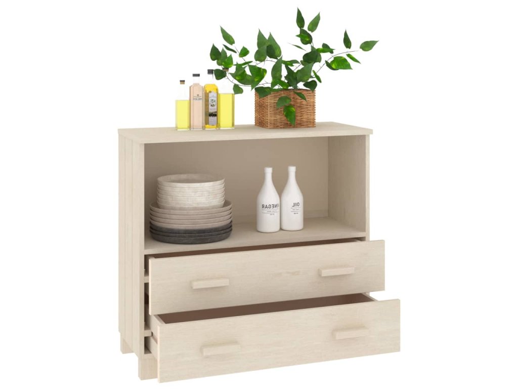 Zásuvková skrinka je vyrobená z masívneho borovicového dreva, vďaka čomu je stabilná a pevná. Komoda má 1 priehradku a 2 zásuvky, ktoré poskytujú dostatok úložného priestoru na uchovávanie každodenných potrieb dobre organizovaných a na dosah ruky. Pevná doska je ideálna na vystavenie dekoratívnych predmetov, fotorámikov a rastlín v črepníkoch.