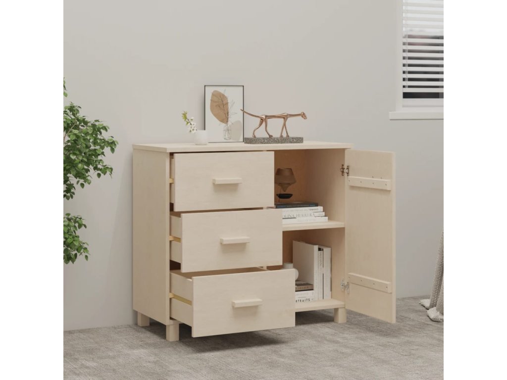 Skrinka so zásuvkami je vyrobená z borovicového masívu, vďaka čomu je stabilná a pevná. Komoda má 1 dvierka a 3 zásuvky, ktoré sa ľahko vysúvajú a poskytujú množstvo priestoru na prehľadné odkladanie bežných potrieb, ktoré tak budete mať vždy poruke. Robustná stolová doska je ako stvorená na vystavenie dekoratívnych predmetov, ako sú rámiky s fotkami či kvety v kvetináčoch.
