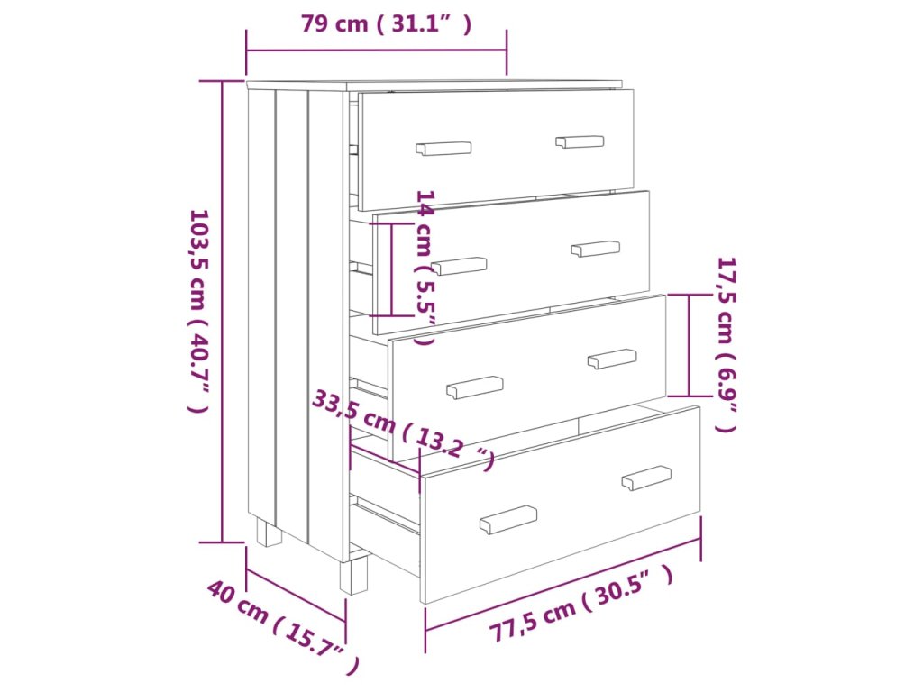Skrinka so zásuvkami je vyrobená z borovicového masívu, vďaka čomu je stabilná a pevná. Komoda má 4 zásuvky, ktoré sa ľahko vysúvajú a poskytujú množstvo priestoru na prehľadné odkladanie bežných potrieb, ktoré tak budete mať vždy poruke. Robustná stolová doska je ako stvorená na vystavenie dekoratívnych predmetov, ako sú rámiky s fotkami či kvety v kvetináčoch.
