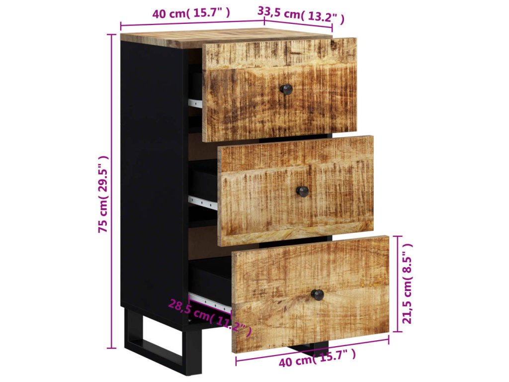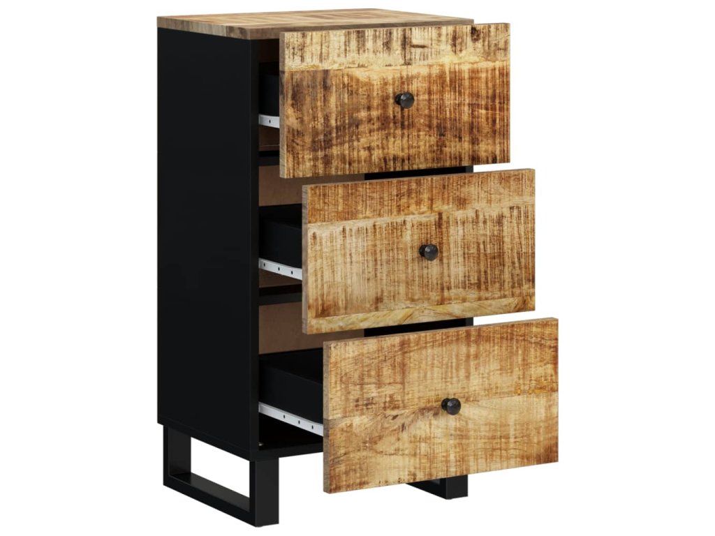 - Masívne mangovníkové drevo: Táto skrinka je vyrobená z masívneho mangovníkového dreva, čo je tvrdé drevo s bohatou štruktúrou. Masívne mangovníkové drevo nielenže unesie aj vyššiu hmotnosť, ale odoláva aj opotrebovaniu časom.