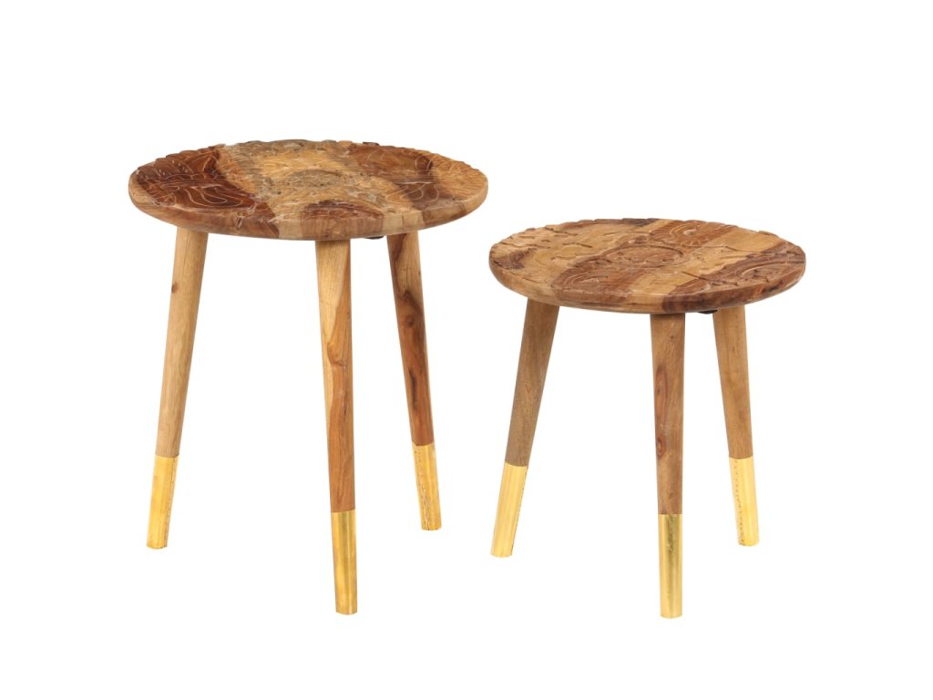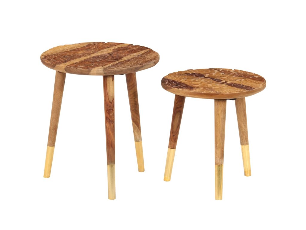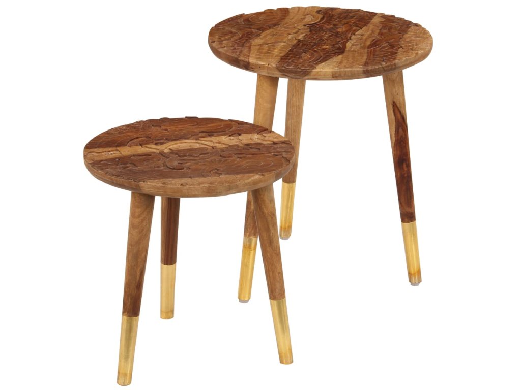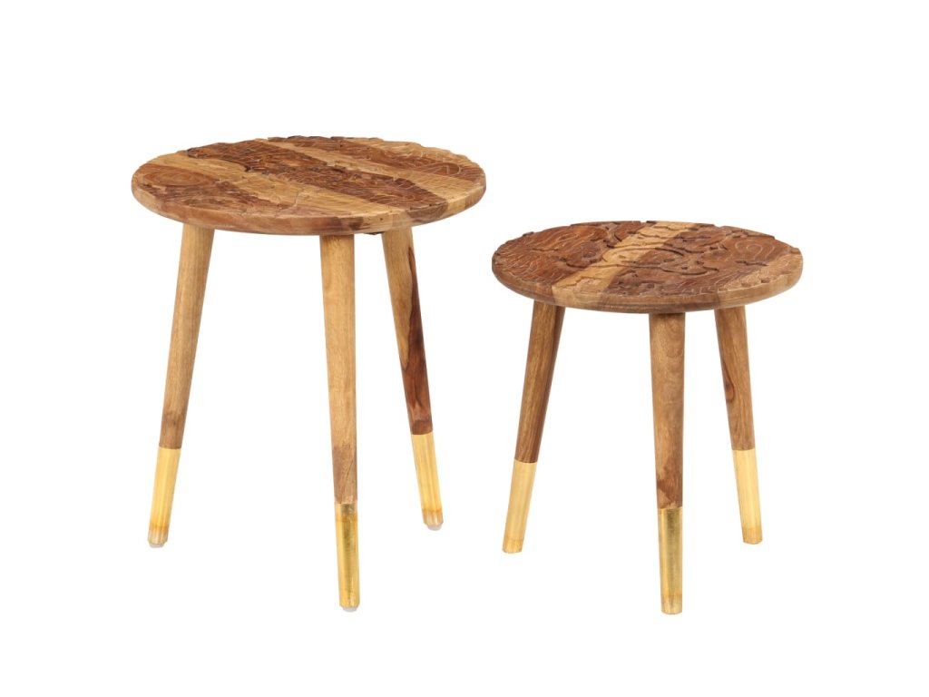 Tieto robustné drevené stolíky sú vyrobené z dreveného masívu, vďaka čomu sú trvácne a krásne. Každý krok výrobného procesu sa vykonáva s najväčšou starostlivosťou, či už je to leštenie, natieranie alebo lakovanie. Vďaka vynikajúcemu remeselnému opracovaniu a krásnej textúre dreva je každý kus nábytku jedinečný a trochu odlišný od ostatných. Povrch stolíka zdobia krásne rezby, a tak celá súprava nábytku pôsobí kreatívne a krásne. Stolíky sa jednoducho montujú.