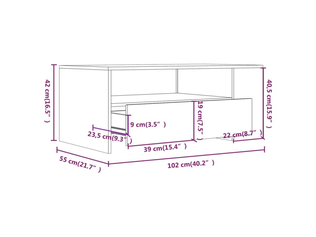 - Dostatok úložného priestoru: Tento konferenčný stolík udrží váš obytný priestor bez neporiadku vďaka poličke, zásuvkám a priečinkom. Je ideálny na umiestnenie kníh, časopisov alebo malých predmetov, ktoré chcete mať na dosah ruky.