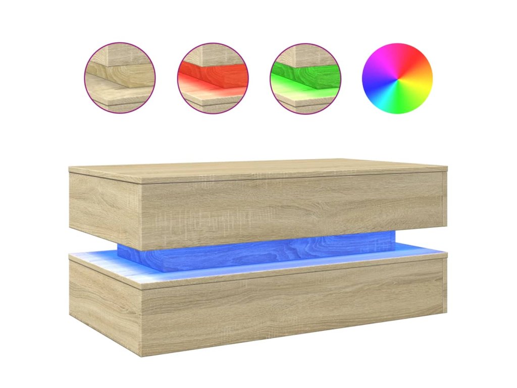 - RGB LED svetlá: Stolík k pohovke je vybavený žiarivými RGB LED svetlami. Vďaka rôznym nastaveniam môžete jednoducho zmeniť farby svetiel a dokonca nastaviť aj ich automatické prispôsobenie. Tieto LED svetlá nielenže zvýrazňujú moderný vzhľad stredového stolíka, ale taktiež ho aj zatraktívňujú.