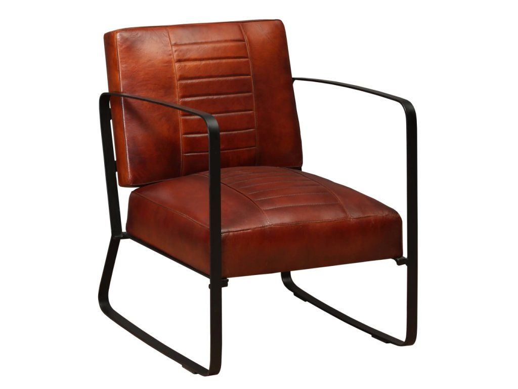 Toto štýlové kreslo s industriálnym vzhľadom a pôsobivým robustným dizajnom predstavuje skvelý ozdobný doplnok do obývačky a vďaka sedadlu a operadlu s poťahom z pravej kozej kože a hustou a pohodlnou molitanovou výplňou vám navyše poskytne ideálne miesto na odpočinok po náročnom dni v práci. Pevný oceľový rám a nohy umocňujú industiálny vzhľad kresla.