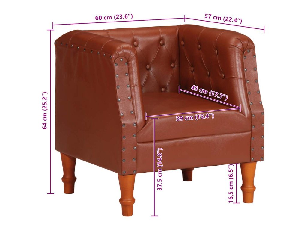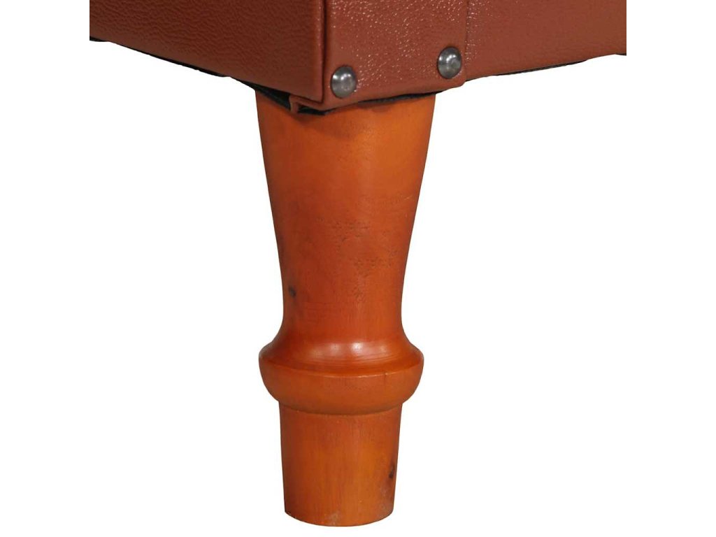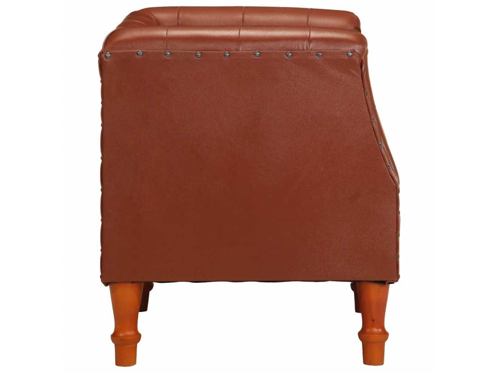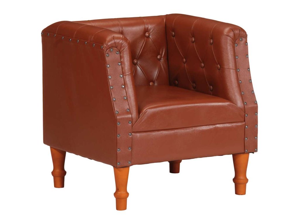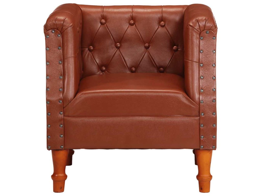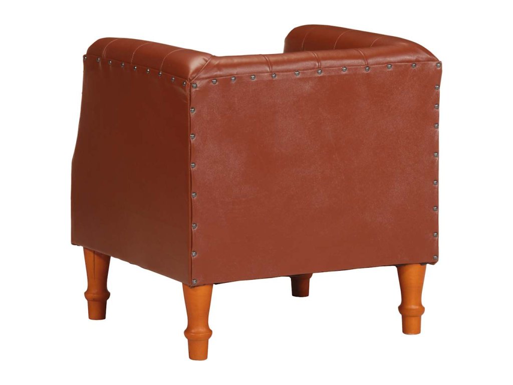 Klubové kreslo má poťah z pravej kozej kože, ktorá je mäkká, trvácna a vyžaruje z nej vintage šarm. Rám je vyrobený z mangového masívu a umocňuje retro štýl kresla. Poťah s ozdobnými nitmi kreslu dodáva industriálny vzhľad. Vďaka zaobleným opierkam na ruky a sedadlu a operadlu s hustou výplňou vám toto kožené kreslo poskytne dokonalé a pohodlné miesto na sedenie, kde si budete môcť oddýchnuť pri sledovaní televízie či počúvaní hudby.