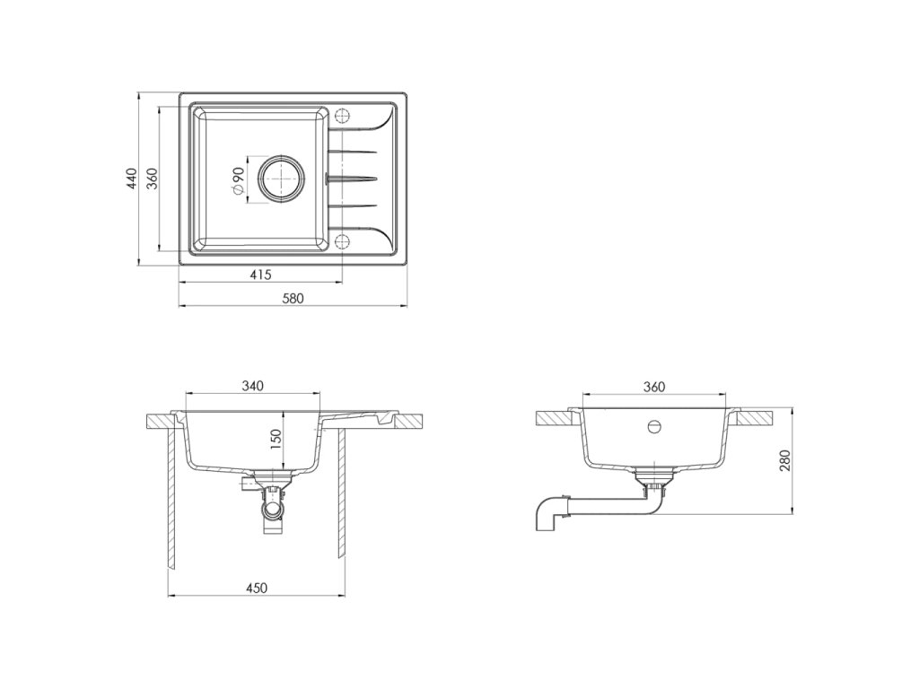 - Minimálna šírka skrinky pod drez: 450 mm