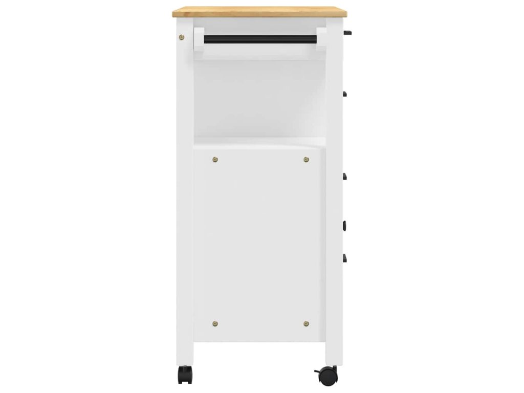 - Trvácny rám: Masívne borovicové drevo je krásny prírodný materiál. Borovicové drevo má rovnú kresbu a nachádzajú sa na ňom uzly, ktoré tomuto materiálu dodávajú charakteristický rustikálny vzhľad. Tento kuchynský úložný vozík je vyrobený z masívneho borovicového dreva, a je odolný a robustný.