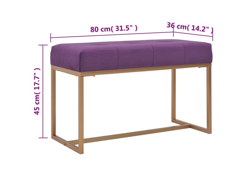 Fialové zamatové čalúnenie je mäkké na dotyk a veľmi príjemné. Do vášho interiéru dodá farbu. Železné nohy s práškovanou povrchovou úpravou zlepšujú stabilitu a životnosť lavičky. Naša lavička do chodby elegantne vyzdobí váš obývací priestor a stane sa nepostrádateľnou súčasťou vašej izby.