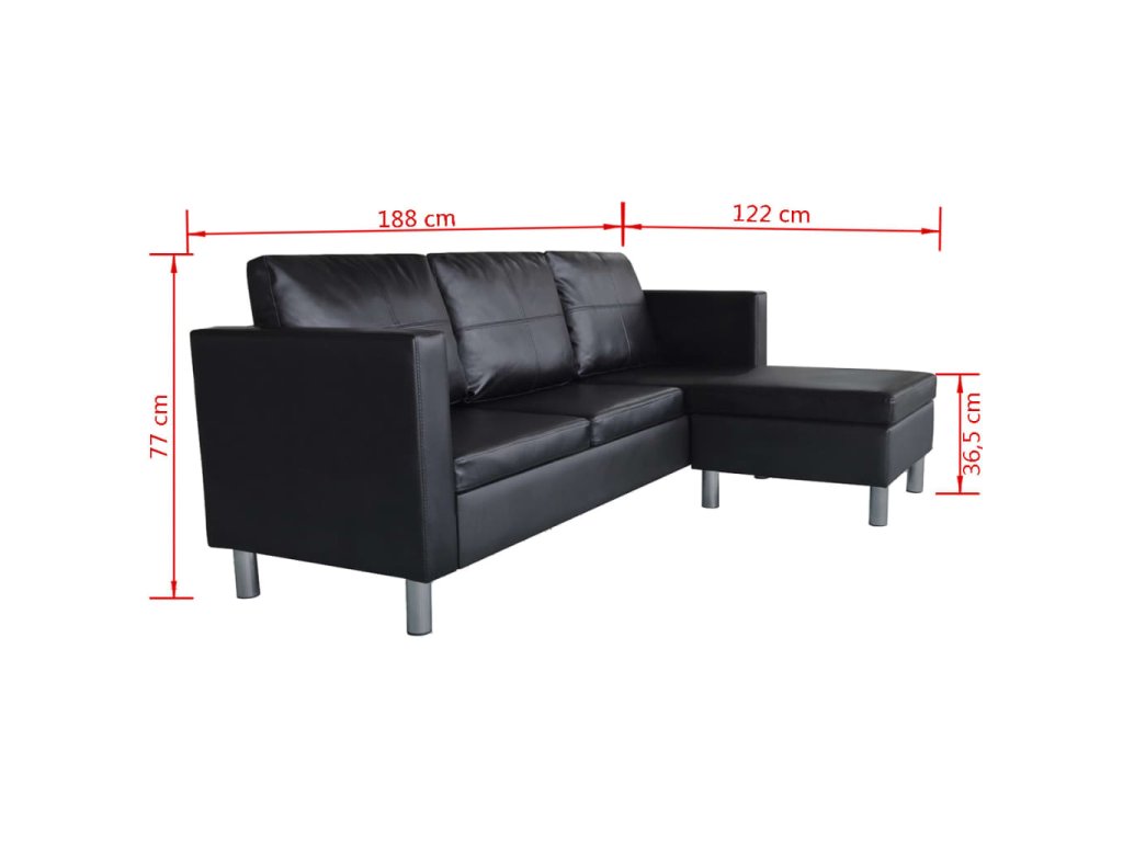 Pohovka má široké sedadlá a nahusto čalúnené podložky pre optimálny komfort pri sedení. Súprava pohoviek je potiahnutá lesklou a trvácnou umelou kožou, ktorá sa dá ľahko očistiť. Rohové časti pohovky majú pevnú konštrukciu a stoja na odolných, pochrómovaných železných nohách. Všestranná pohovka zahŕňa leňošku, ktorá sa dá umiestniť na obidve strany dvojmiestneho kresla, takže si môžete miestnosť zariadiť rôznymi spôsobmi.