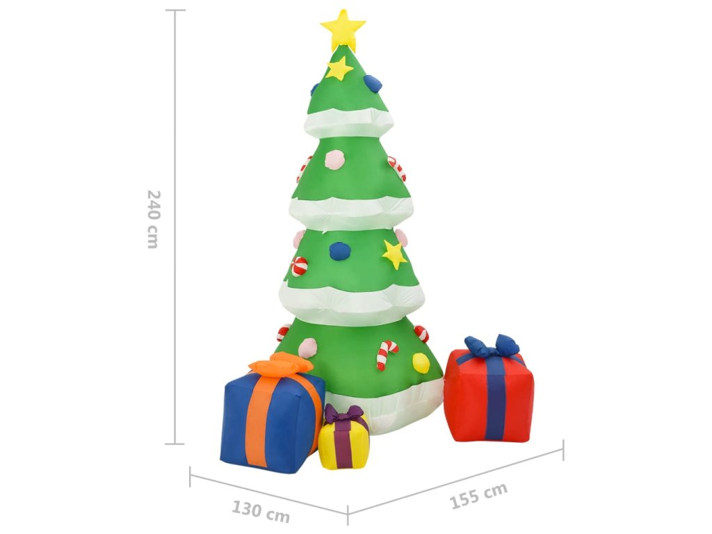 Tento obrovský strom bude určite pôsobivým doplnkom k vašim vonkajším vianočným dekoráciám. Nafukovací strom je vyrobený z látky a je ľahký a odolný voči poveternostným vplyvom. Ozdoba sa sama nafúkne za pár sekúnd. Strom sa dá po vypustení ľahko uložiť na ďalšiu sviatočnú sezónu. Táto vianočná dekorácia je vybavená LED diódami, ktoré vyžarujú jasné svetlo a sú energeticky úsporné. Súčasťou balenia sú aj uzemňovacie kolíky a laná na uchytenie.