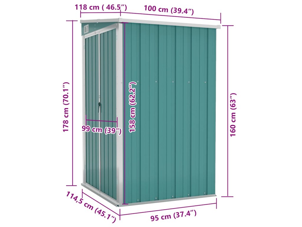 Keďže je vyrobený z pozinkovanej ocele a kovu, skladovací domček vyžaduje minimálnu údržbu a je veľmi odolný. Dvojité otváracie dvere vpredu umožňujú jednoduchý vstup a výstup. Plastová rukoväť s funkciou zámku zaisťuje bezpečnosť vašich vecí. Okrem toho dažďová voda automaticky odteká zo strechy vďaka šikmej konštrukcii.