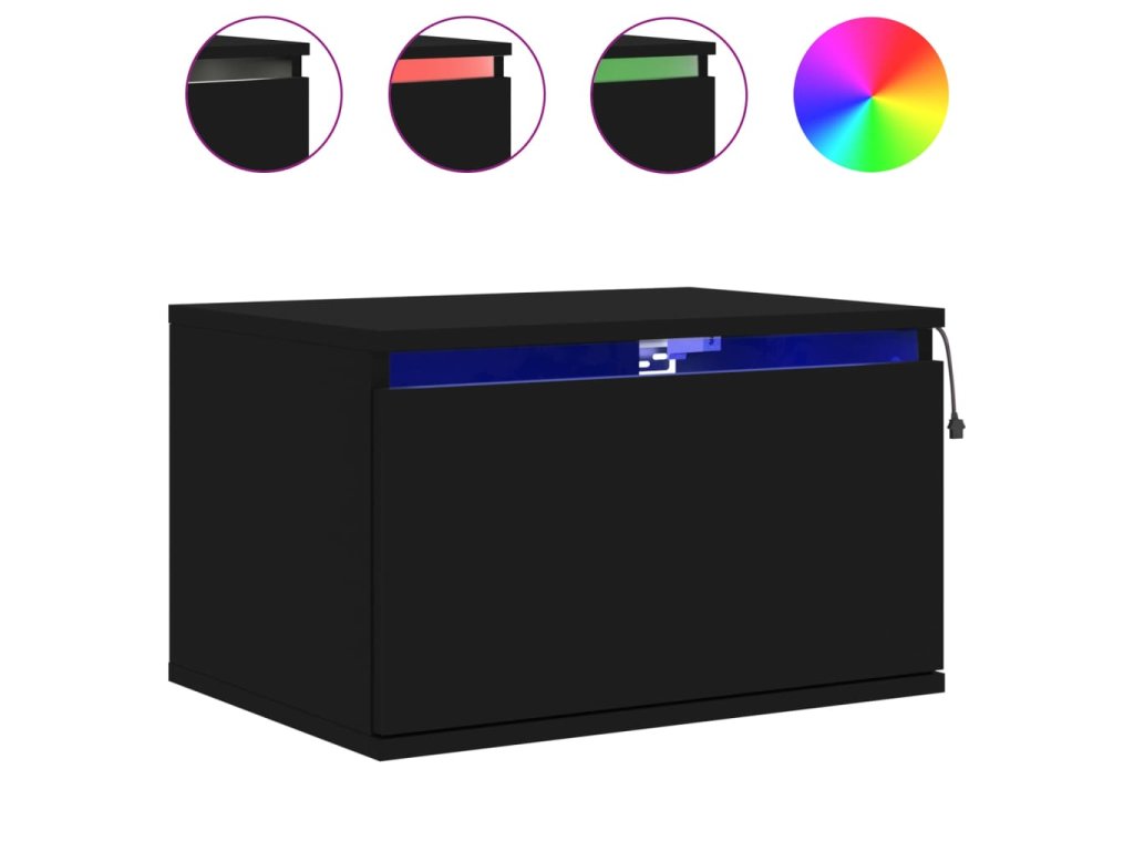 - RGB LED svetlá: Plávajúca nočná skrinka je vybavená žiarivými RGB LED svetlami. Vďaka rôznym nastaveniam môžete jednoducho zmeniť farbu svetiel a dokonca nastaviť aj ich automatické prispôsobenie. Tieto LED svetlá nielenže zvýrazňujú moderný vzhľad skrinky, ale prispievajú aj k jej módnemu vzhľadu.