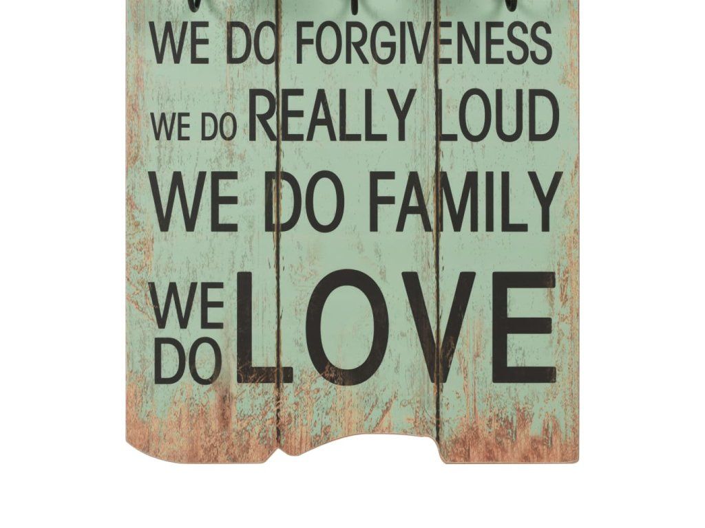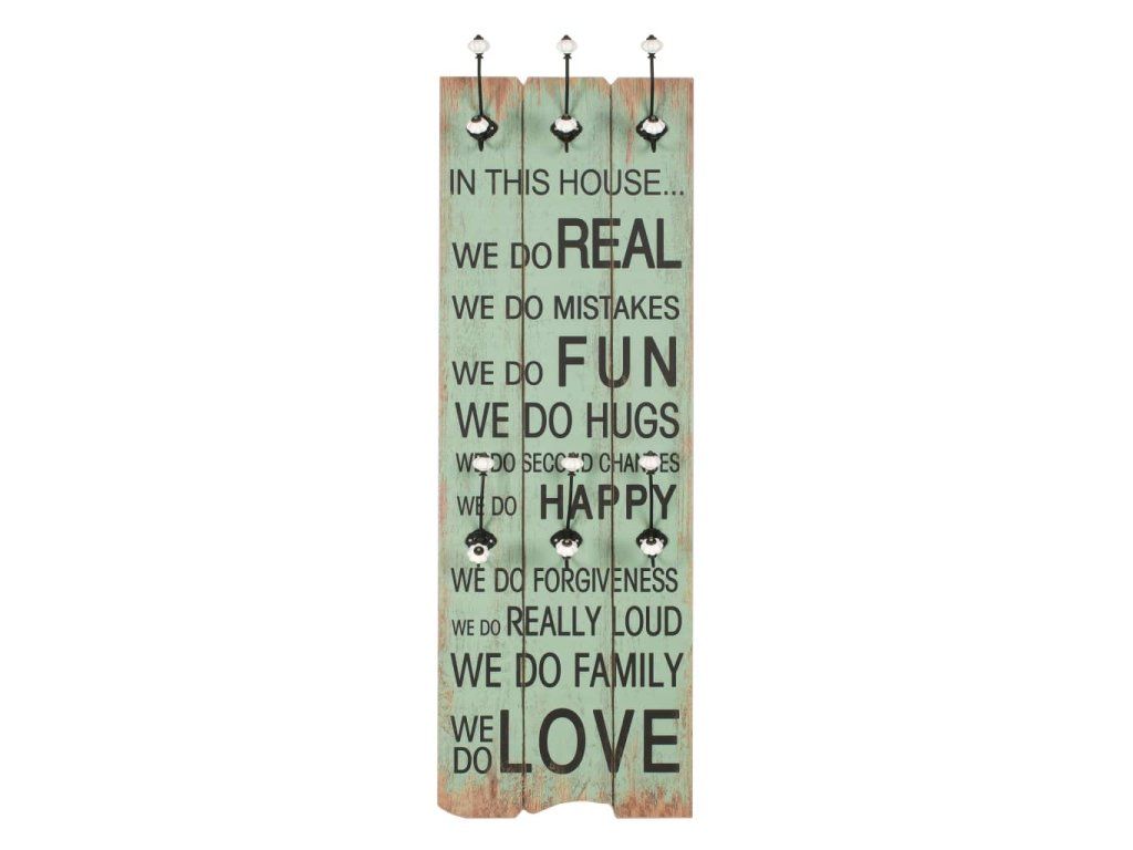 Tento nástenný vešiak na kabáty so 6 háčikmi, s nápisom vo vintage štýle, ktorý znamená "V tomto dome...robíme skutočné veci, robíme chyby, bavíme sa, objímame sa, dávame druhé šance, sme šťastní, odpúšťame, sme hluční, tvoríme rodinu, máme sa radi"; sa stane skutočne pútavým prvkom, ktorý si vaši hostia okamžite všimnú.