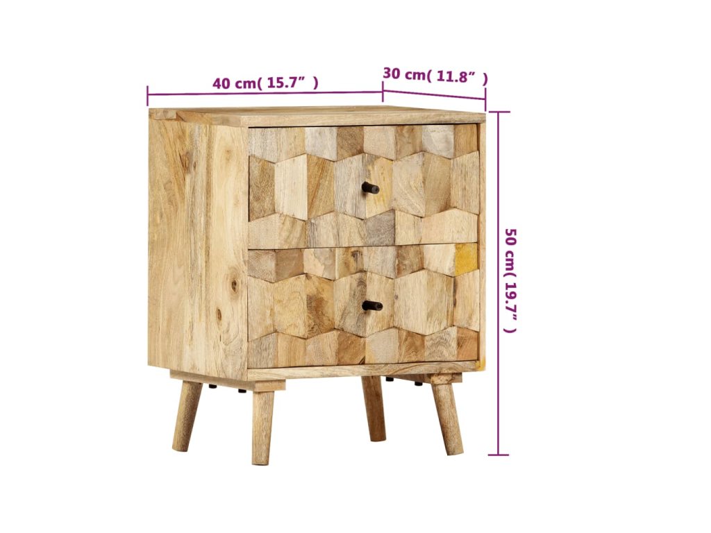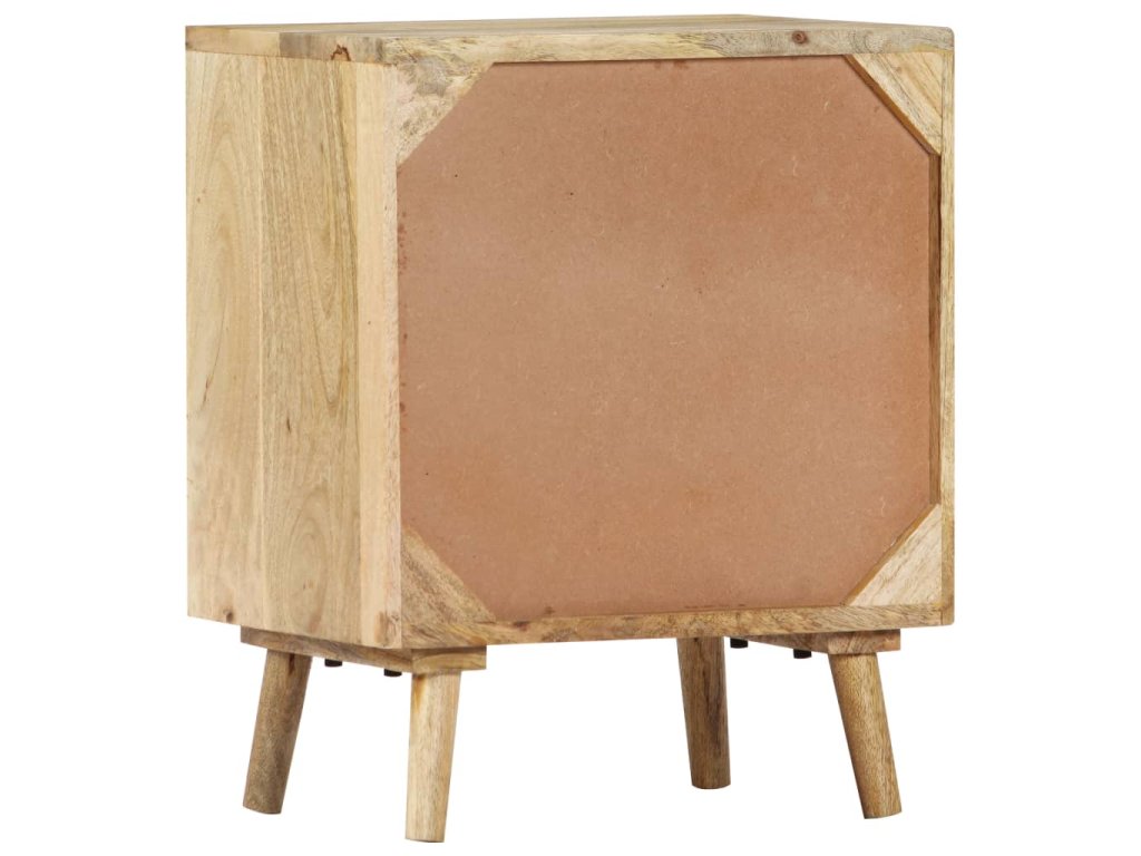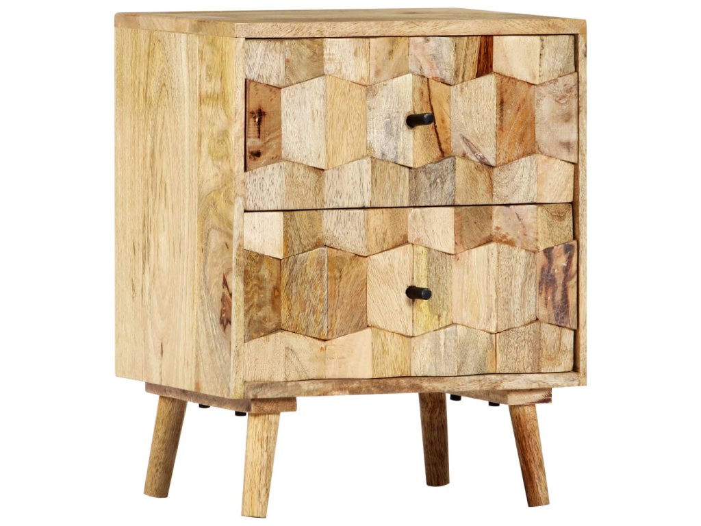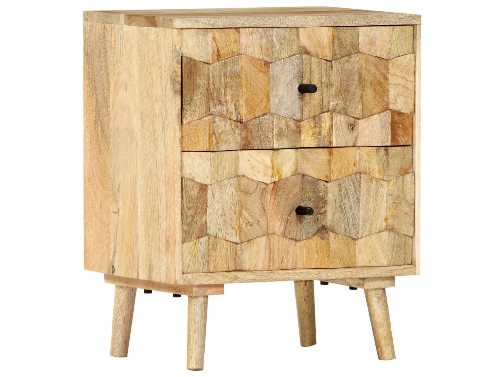 Nočný stolík je vyrobený z masívneho mangového dreva a vďaka lešteniu a lakovaniu dostal krásny povrch, čo mu dodalo rafinovaný vzhľad. Mango je husté a pevné tvrdé drevo, ktoré má na svojom povrchu krásne hnedé a zlaté pruhy a kontúry. Obidve zásuvky s mriežkovým vzorom pridávajú nočnej skrinke na kráse a poskytujú dostatok úložného priestoru na uloženie vašich drobností na dosah. Skrinka k posteli sa dá ľahko zmontovať a očistiť vlhkou handričkou.