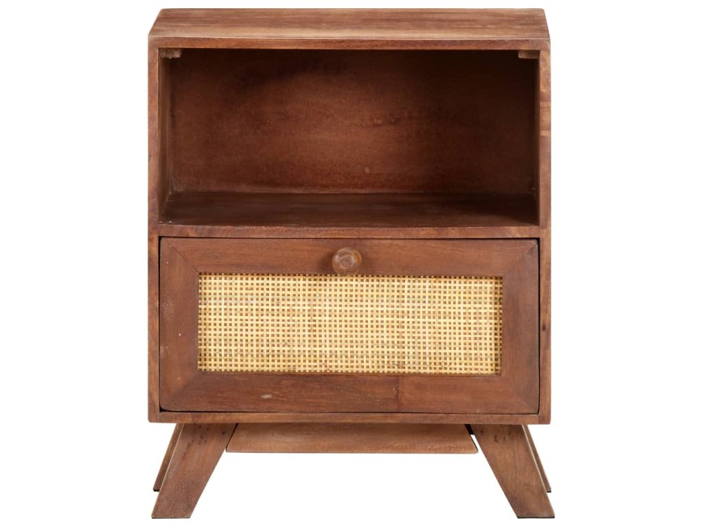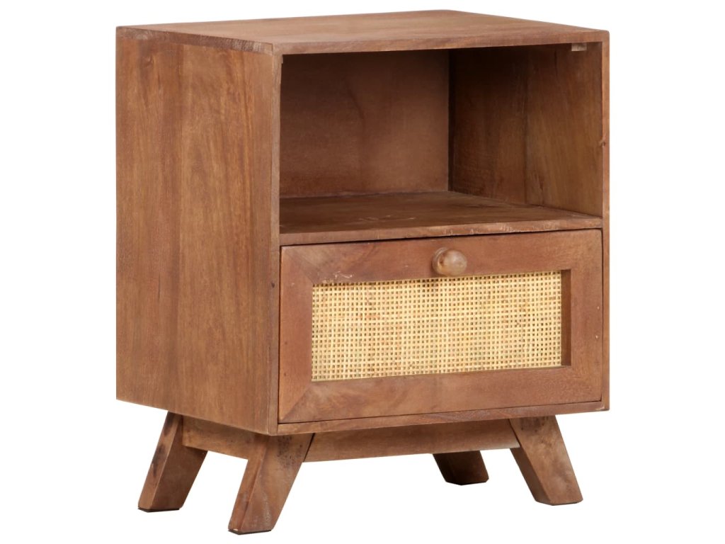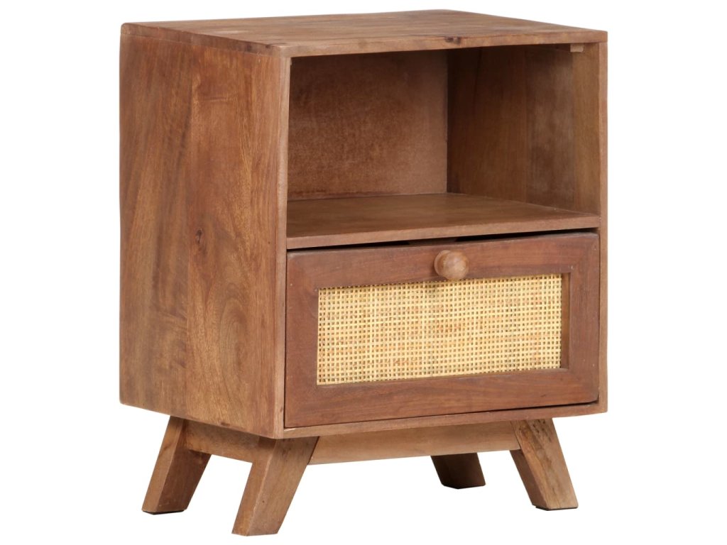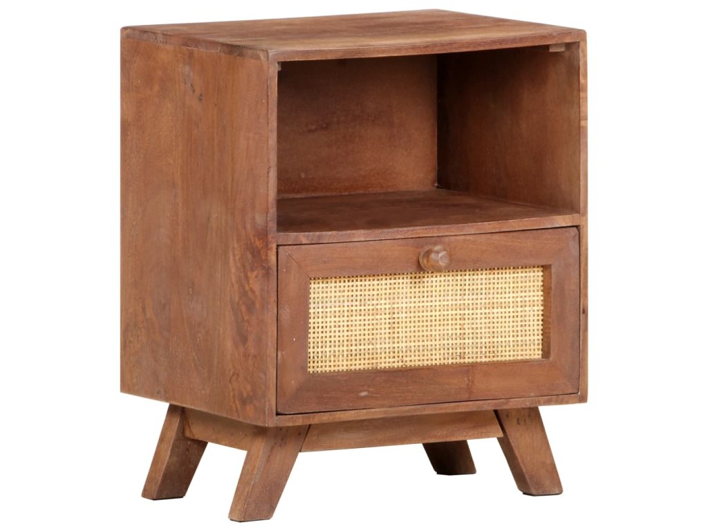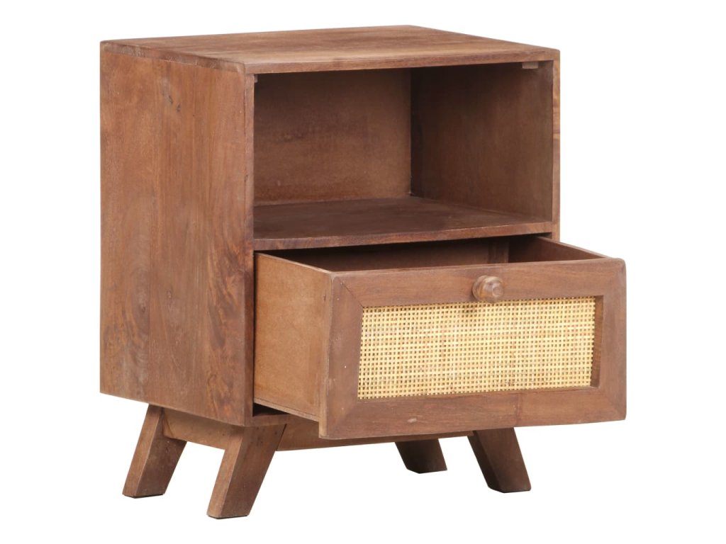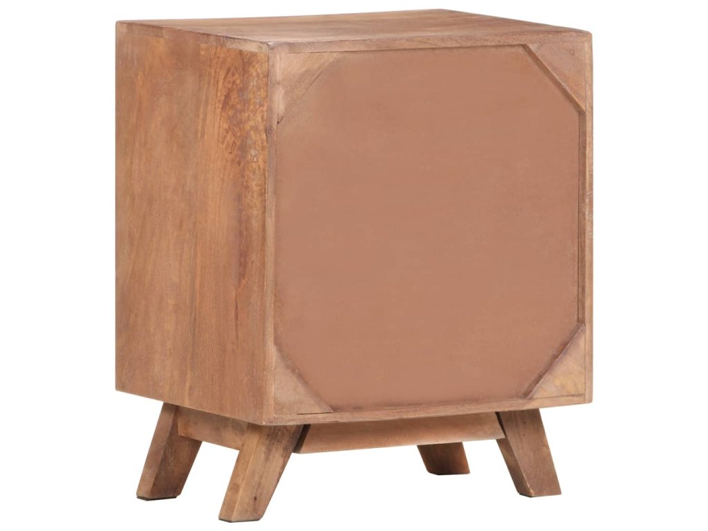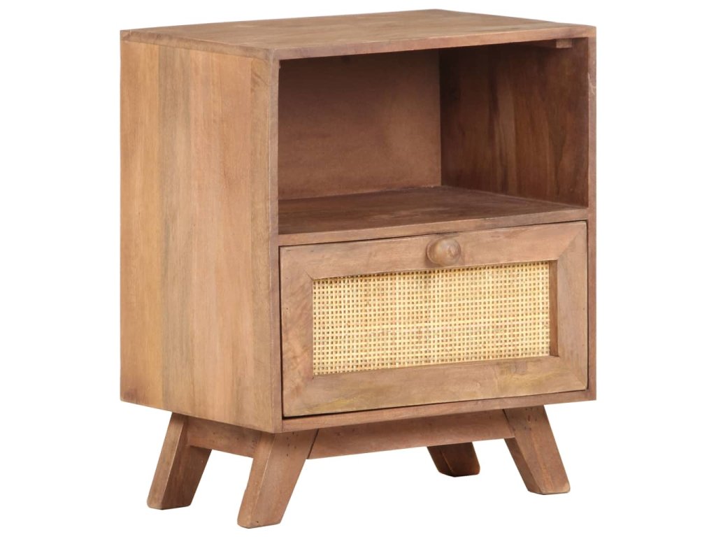 Tento nočný stolík je vyrobený z masívneho mangovníkového dreva, tropického tvrdého dreva. Mangovníkové drevo nielenže unesie aj vyššiu hmotnosť, ale odoláva aj opotrebovaniu časom. Vďaka vynikajúcemu remeselnému spracovaniu a krásnej štruktúre dreva je každý kus trochu iný od ostatných. Táto bočná skrinka má zásuvku a policu, takže do nej môžete umiestniť knihy, časopisy a iné predmety. Pevná vrchná časť je ideálna na umiestnenie hodín a lámp.