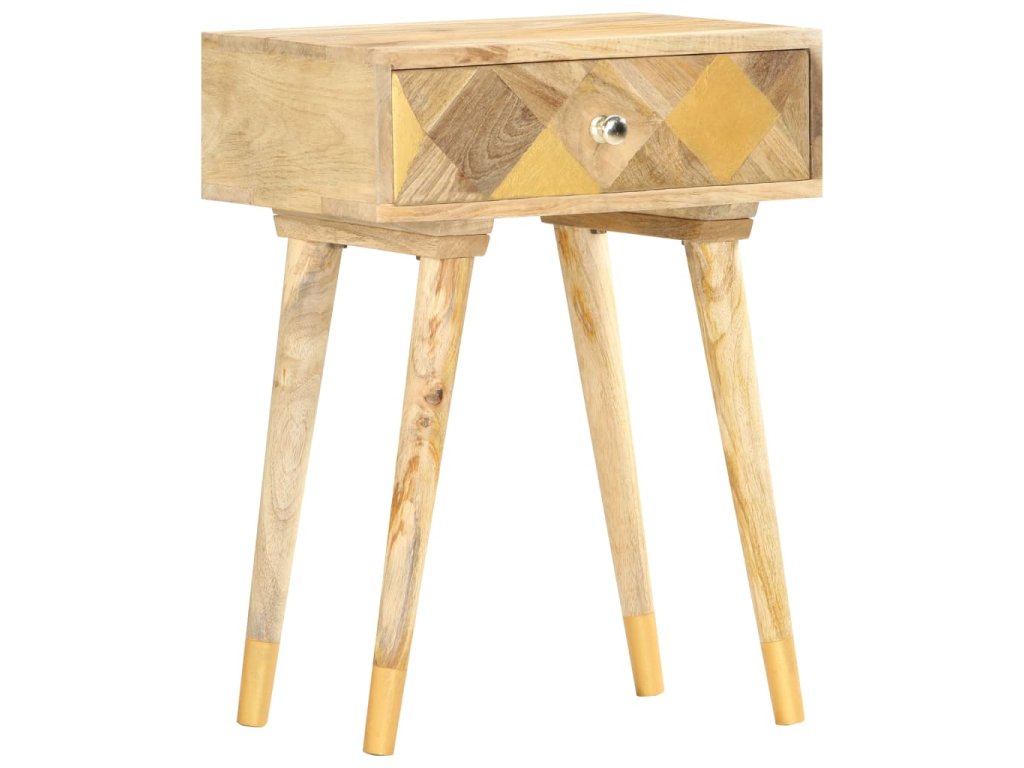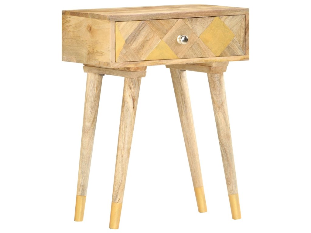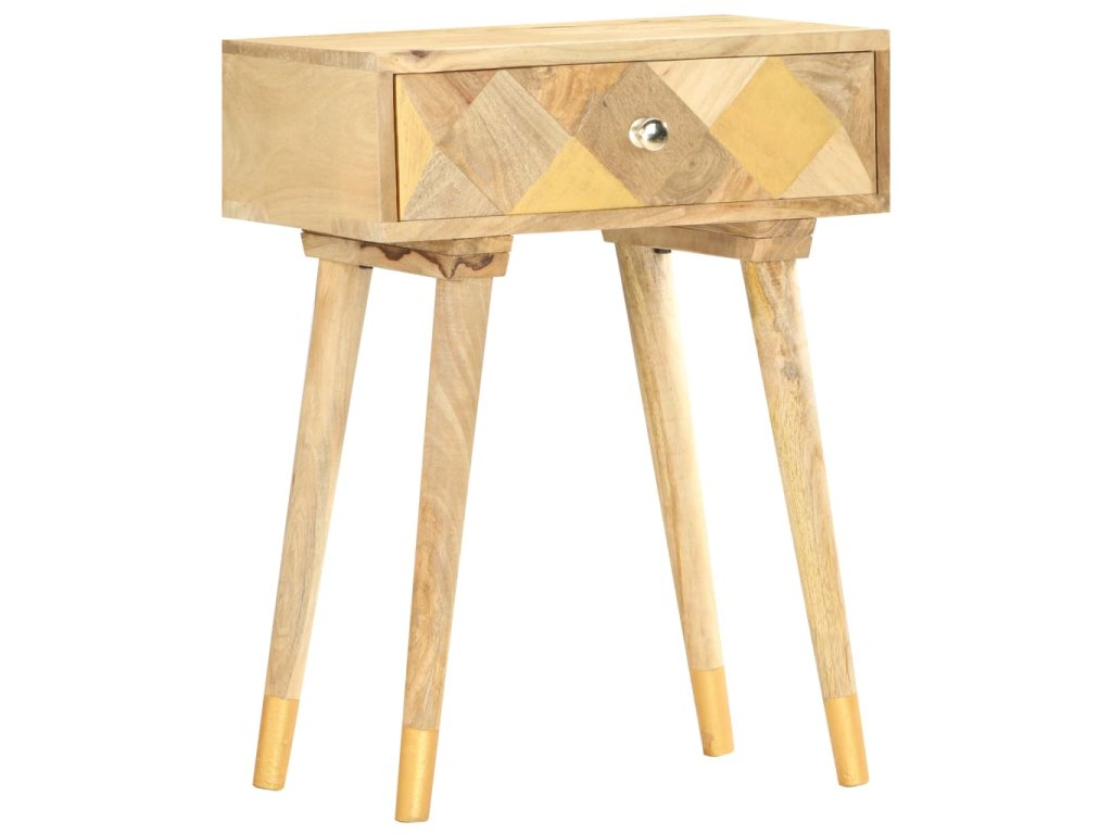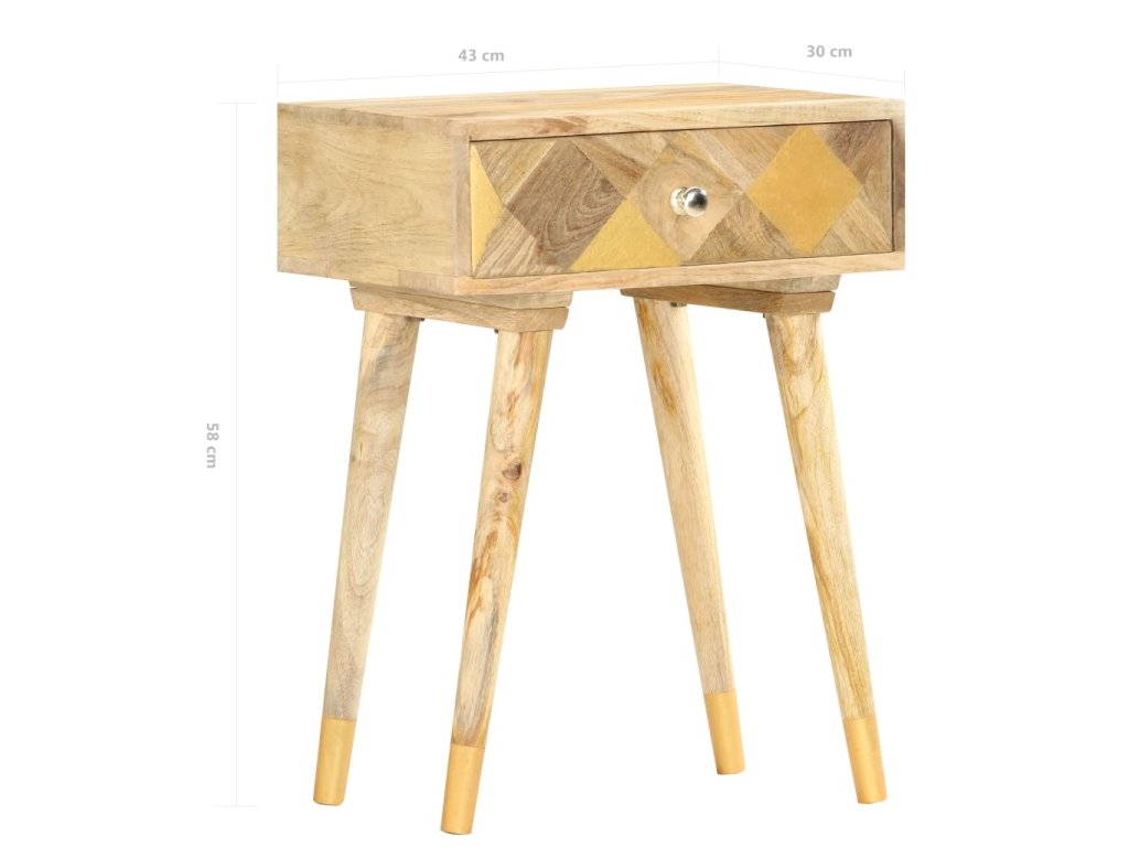 Nočný stolík je vyrobený z mangového masívu, ktorý bol leštený, natieraný a lakovaný a táto krásna povrchová úprava mu dodáva rafinovaný vzhľad. Mangové drevo je husté a robustné tvrdé drevo, ktoré má na svojom povrchu krásne hnedé alebo zlatisté prúžky a kresby. Zásuvka poskytuje množstvo úložného priestoru na odkladanie menších predmetov, ktoré tak budete mať vždy poruke.