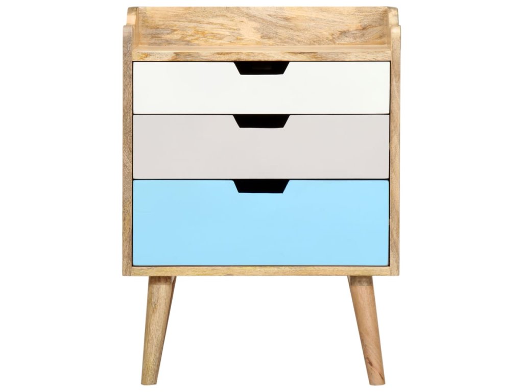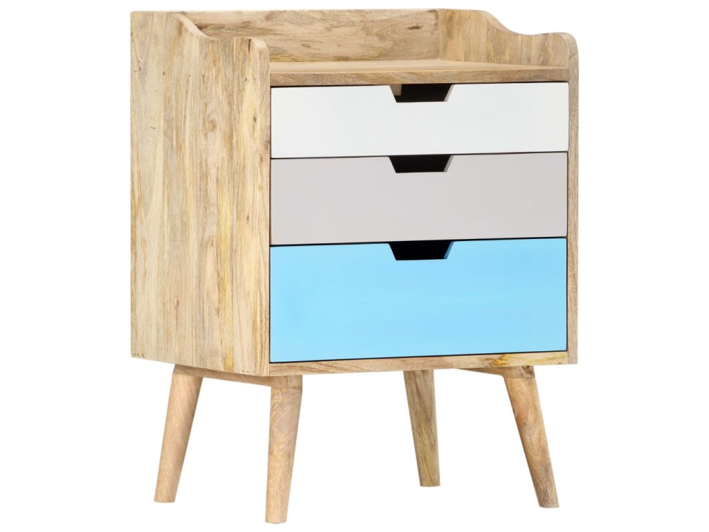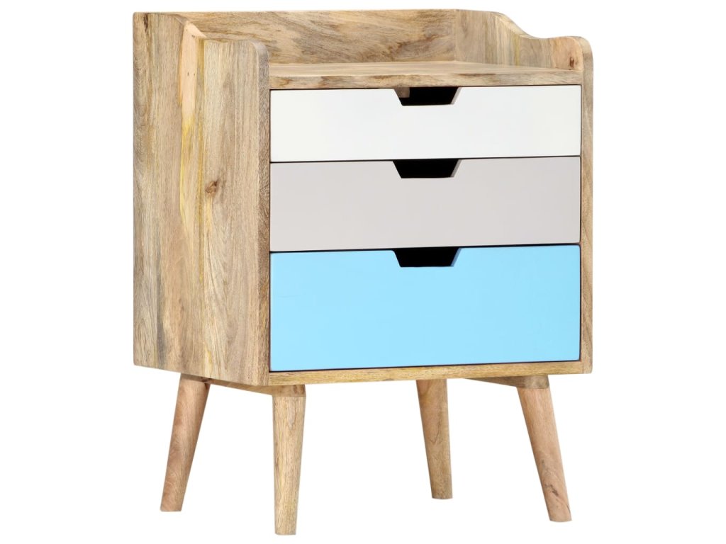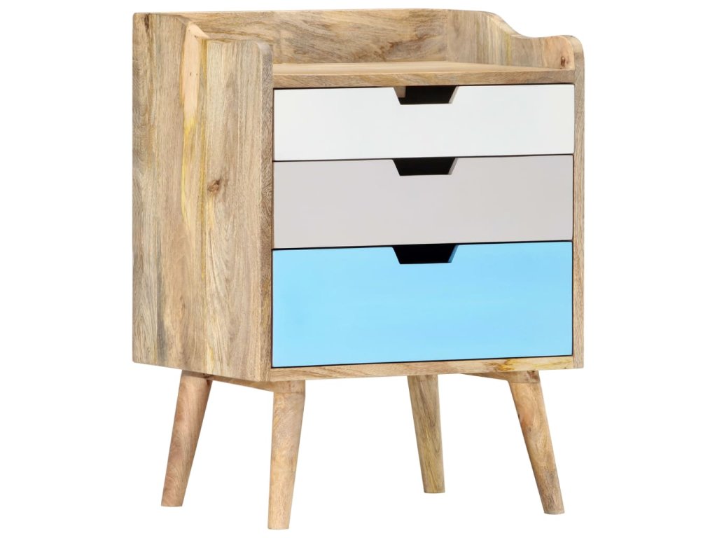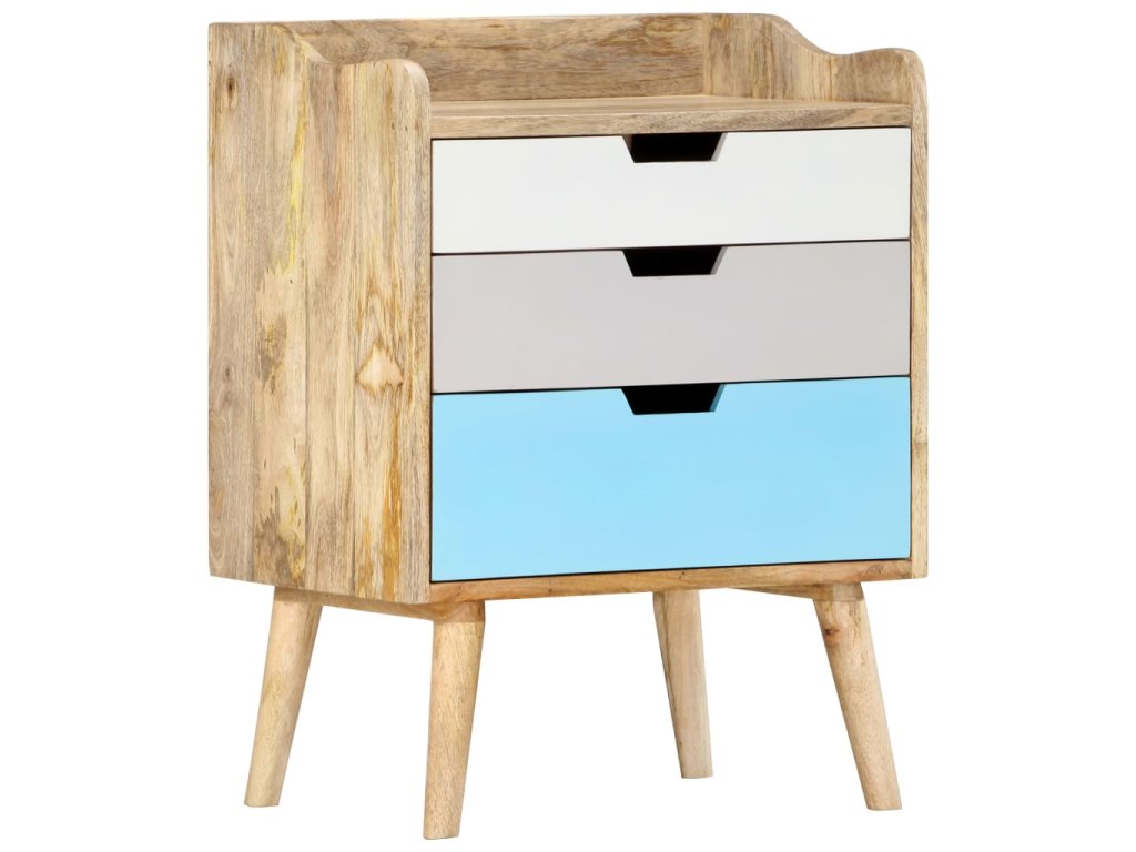 Nočný stolík je ručne vyrobený z mangového masívu, ktorý je pevný, trvácny a krásny. Každý krok výrobného procesu sa vykonáva s maximálnou starostlivosťou, či už je to leštenie, natieranie alebo lakovanie. Vďaka remeselnému opracovaniu a krásnej textúre dreva je každý kus nábytku jedinečný a trochu odlišný od ostatných. Stolík má pevnú dosku a tri zásuvky, ktoré poskytujú dostatok priestoru na odkladanie kníh, pohárov či ovládačov, ktoré tak budete mať vždy poruke. Náš nočný stolík sa jednoducho montuje.