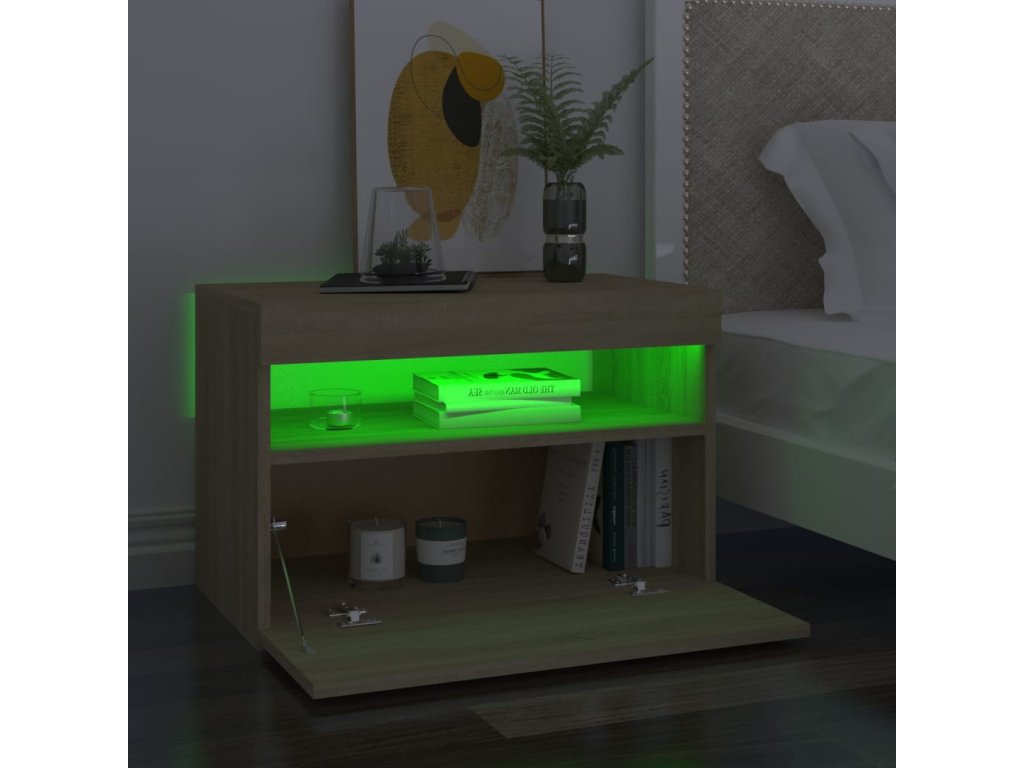 Vďaka robustnej konštrukcii je bočná skrinka veľmi odolná. Poskytne vám dostatok miesta na to, aby ste mali časopisy, knihy, diaľkové ovládače a ďalšie drobnosti uložené a na dosah ruky. Tieto nočné stolíky sú vybavené RGB LED svetlami, ktoré ponúkajú rôzne farby svetiel, ale aj automatické prispôsobenie farieb. LED svetlá podčiarkujú moderný vzhľad a prispievajú k štýlovému prevedeniu. Nočné stolíky sa navyše dajú ľahko čistiť vlhkou handričkou.