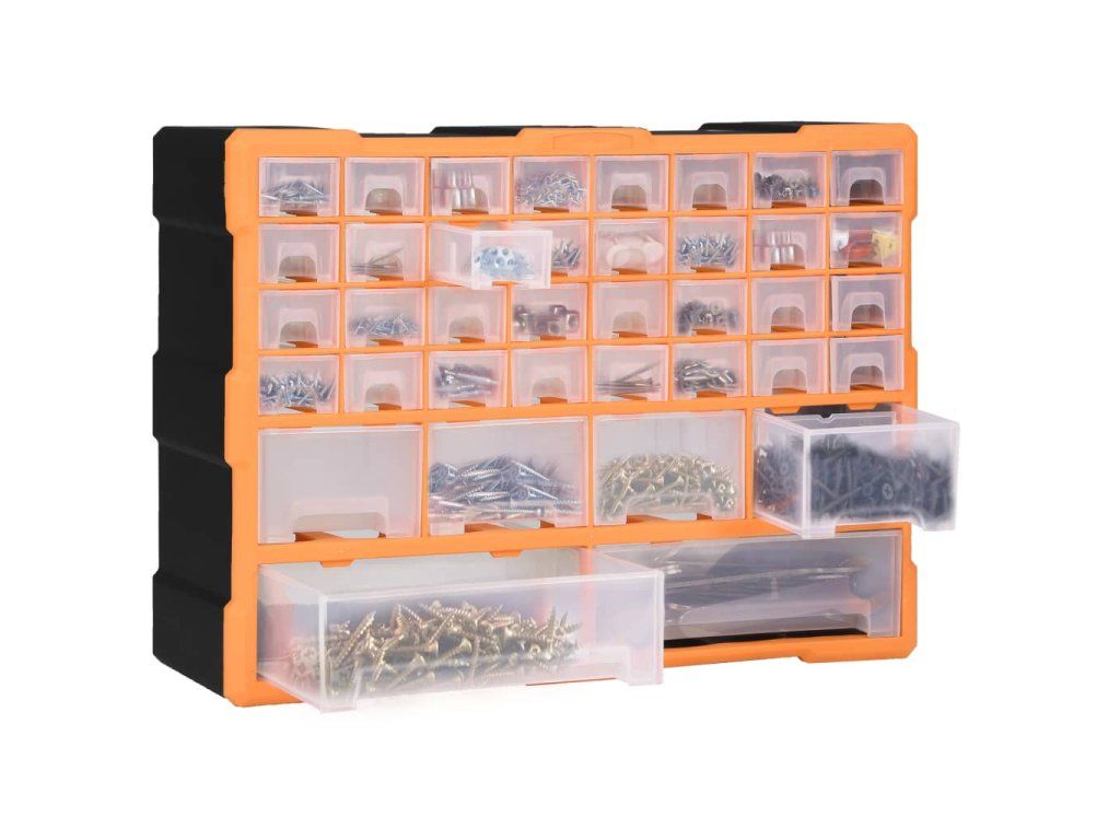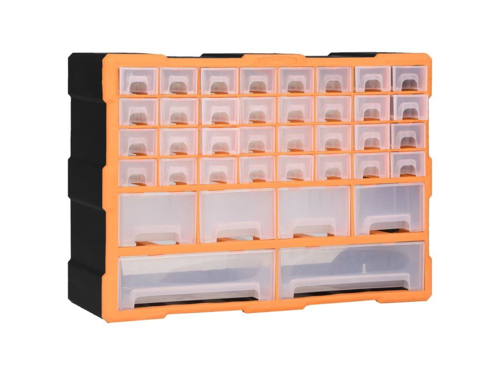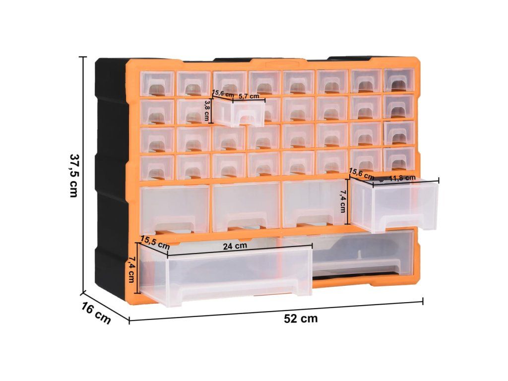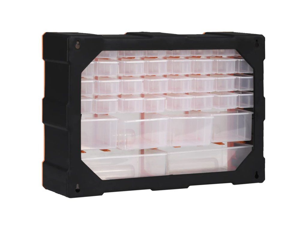 Úložná jednotka obsahuje 32 malých zásuviek, 4 stredne veľké zásuvky a 2 veľké zásuvky, do ktorých si budete môcť odložiť náradie rôznych veľkostí a ktoré sa postarajú o to, aby bolo vaše ručné náradie a príslušenstvo, ako napríklad rôzne spojovacie prvky, vždy prehľadne uložené a poruke. Skrinka na náradie je vyrobená z nárazuvzdorného plastu, ktorý je trvácny a stabilný. Zásuvky sú vyrobené z priehľadného plastu, a tak hneď uvidíte, čo je vo vnútri. Box poskytuje ideálne miesto na odkladanie matíc, skrutiek, klincov, úchytov a rôznych iných súčiastok.