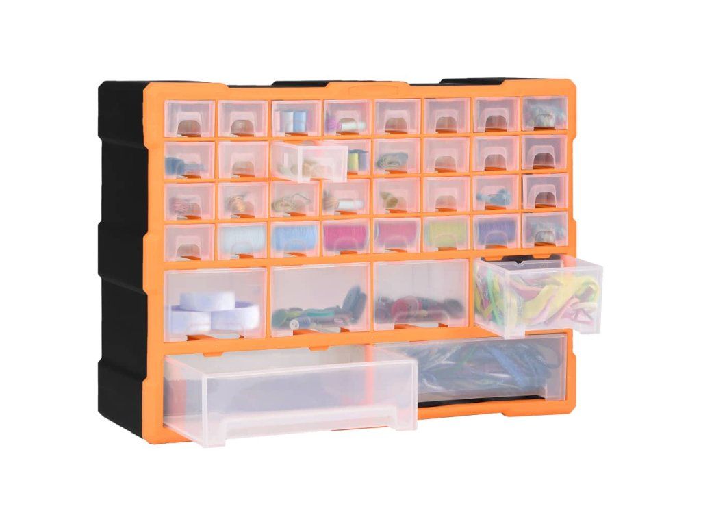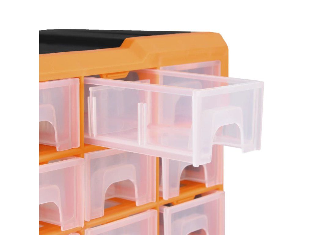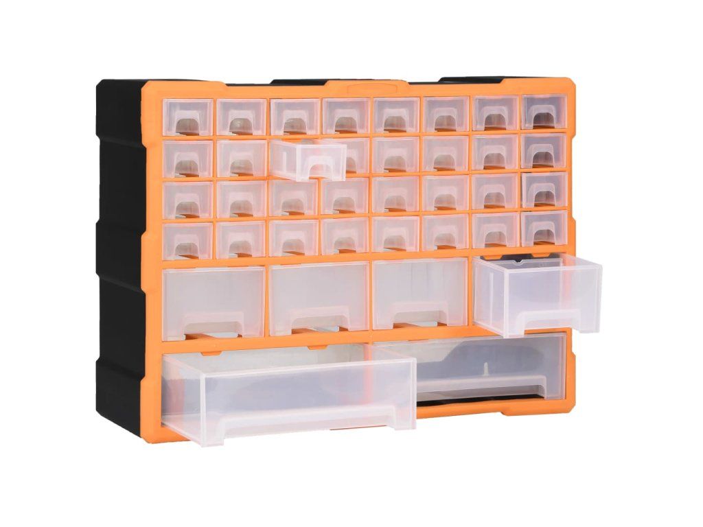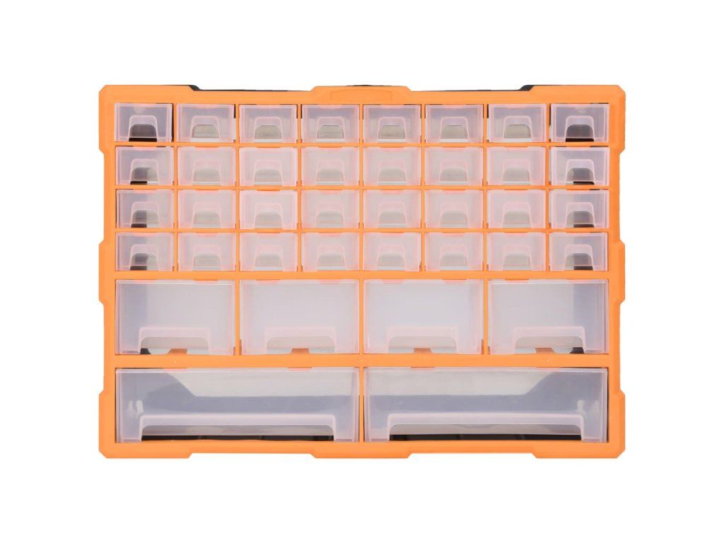 Úložná jednotka obsahuje 32 malých zásuviek, 4 stredne veľké zásuvky a 2 veľké zásuvky, do ktorých si budete môcť odložiť náradie rôznych veľkostí a ktoré sa postarajú o to, aby bolo vaše ručné náradie a príslušenstvo, ako napríklad rôzne spojovacie prvky, vždy prehľadne uložené a poruke. Skrinka na náradie je vyrobená z nárazuvzdorného plastu, ktorý je trvácny a stabilný. Zásuvky sú vyrobené z priehľadného plastu, a tak hneď uvidíte, čo je vo vnútri. Box poskytuje ideálne miesto na odkladanie matíc, skrutiek, klincov, úchytov a rôznych iných súčiastok.