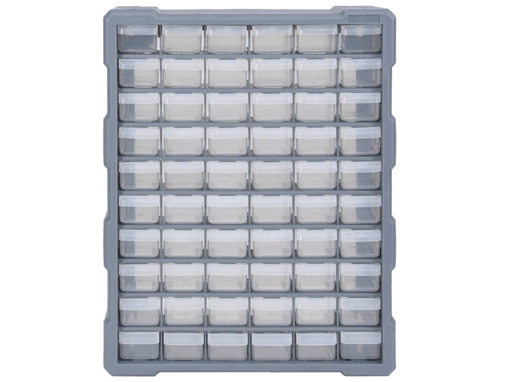 Úložná jednotka obsahuje 60 malých zásuviek, ktoré sa postarajú o to, aby bolo vaše ručné náradie a príslušenstvo, ako napríklad rôzne spojovacie prvky, vždy prehľadne uložené a poruke. Skrinka na náradie je vyrobená z nárazuvzdorného plastu, ktorý je trvácny a stabilný. Zásuvky sú vyrobené z priehľadného plastu, a tak hneď uvidíte, čo je vo vnútri. Box poskytuje ideálne miesto na odkladanie matíc, skrutiek, klincov, úchytov a rôznych iných súčiastok.