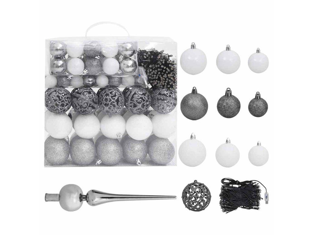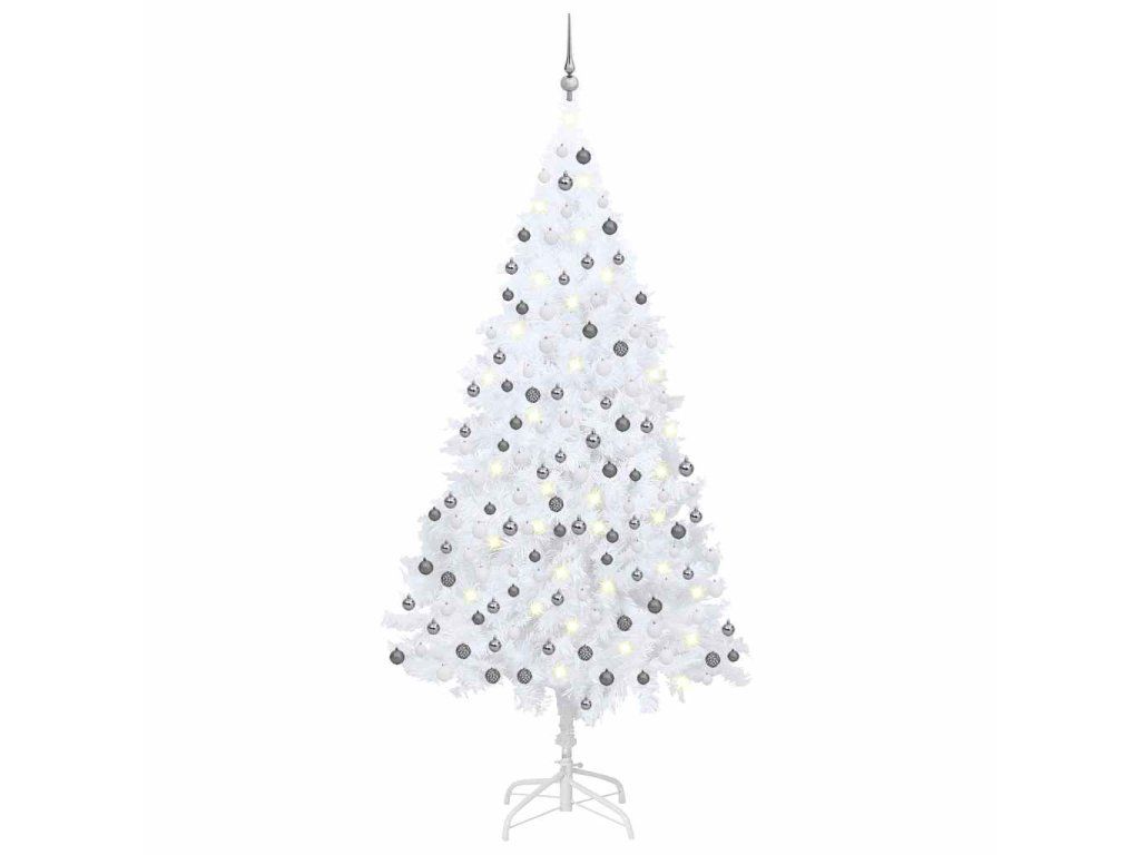 vidaXL Osvetlený umelý vianočný stromček s guľami, biely 210 cm, PVC
