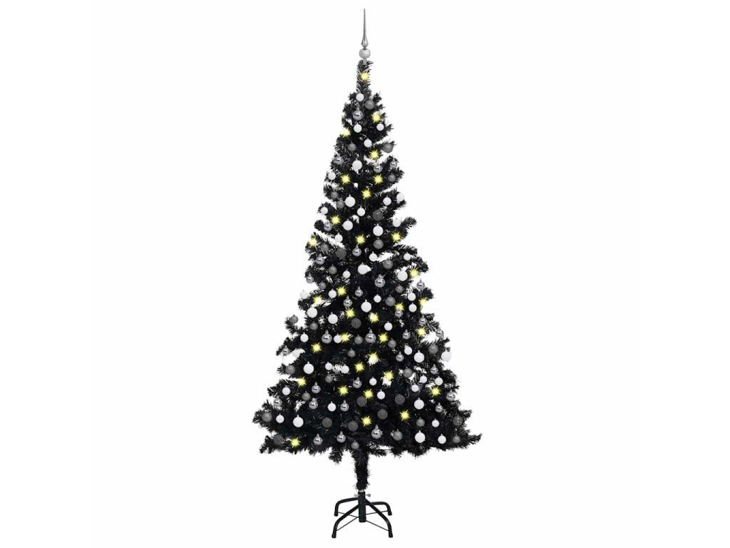 vidaXL Osvetlený umelý vianočný stromček s guľami, čierny 210 cm, PVC
