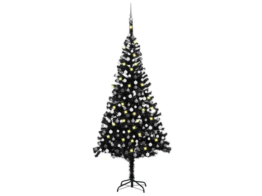 vidaXL Osvetlený umelý vianočný stromček s guľami, čierny 240 cm, PVC