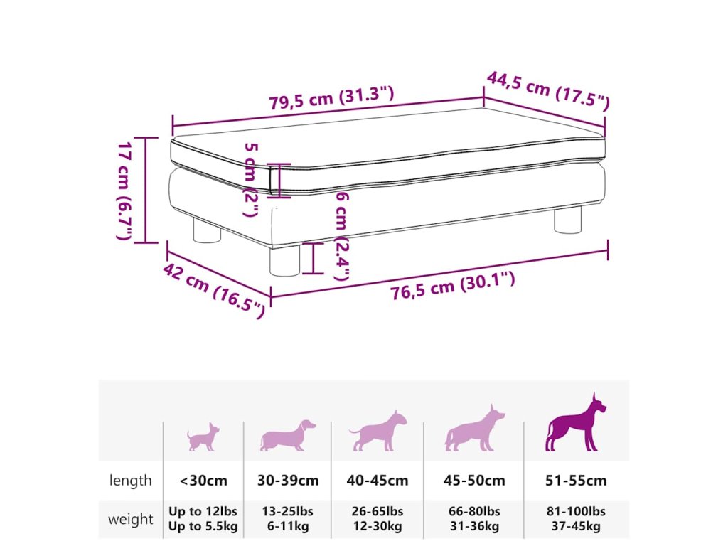 - Pevný a odolný rám: Rám z masívneho borovicového dreva zaisťuje robustnosť a odolnosť pohovky pre psa. Štyri nohy tiež zvyšujú stabilitu.