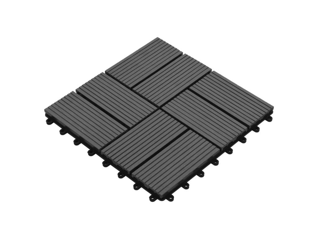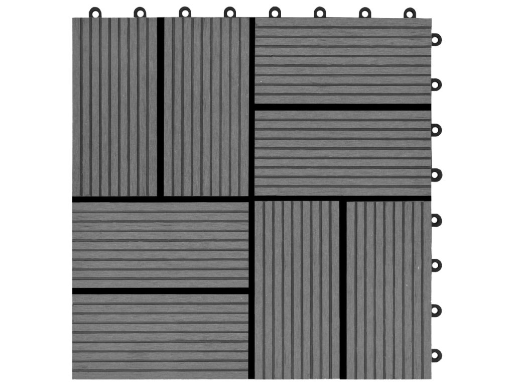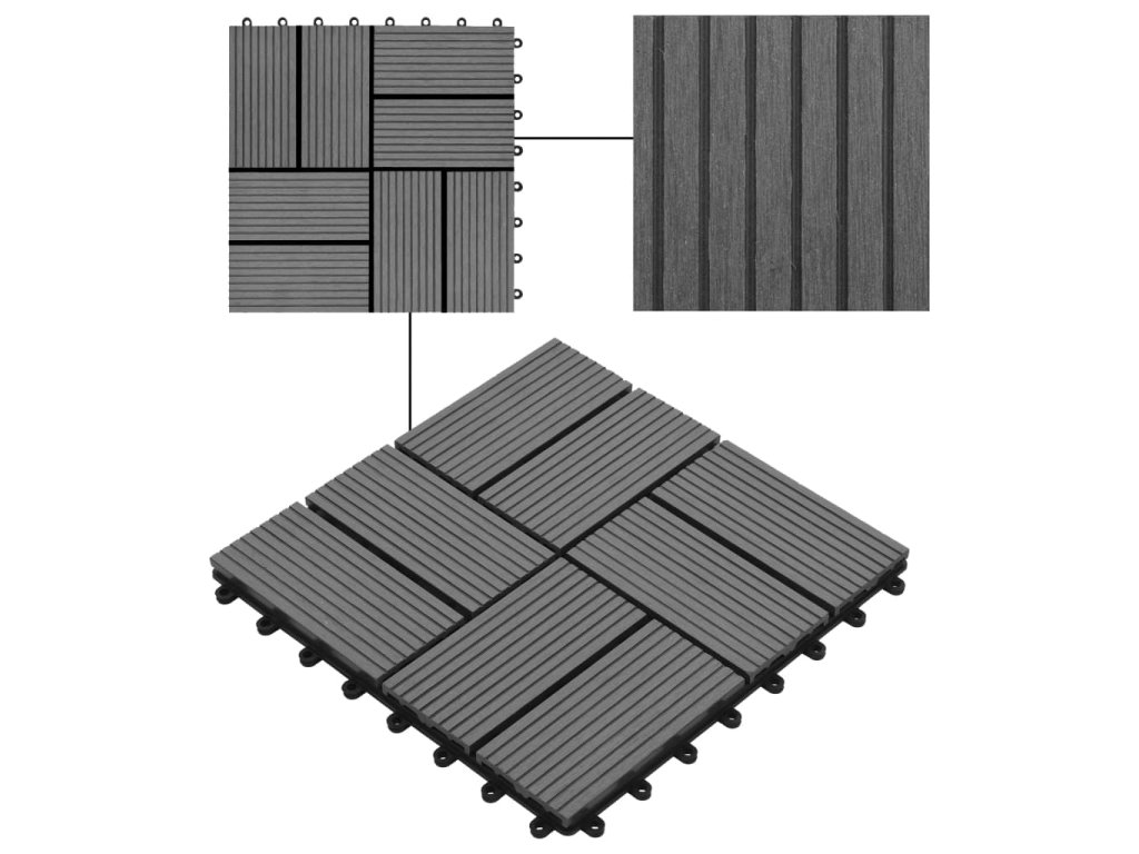 Táto sada pozostáva z 22 podlahových dosiek z WPC s rozmerom 30 x 30 cm a celkovo pokrýva plochu 2 metrov štvorcových. Je ako stvorená na terasy, balkóny, do kúpeľní alebo k bazénu či vírivke.