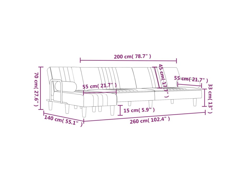 - Celkové rozmery: 260 x 140 x 70 cm (Š x H x V)