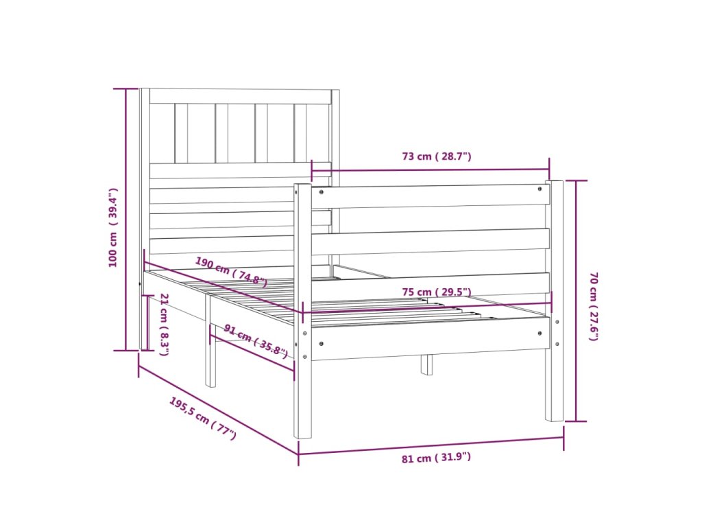 - Celkové rozmery rámu postele: 195,5 x 81 x 100 cm (D x Š x V)