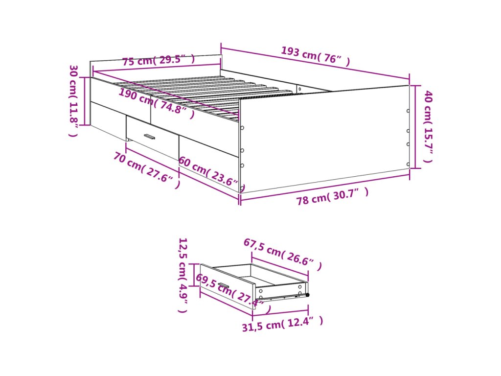 - Rozmery zásuvky postele (každá): 69,5 x 31,5 x 12,5 cm (D x Š x V)