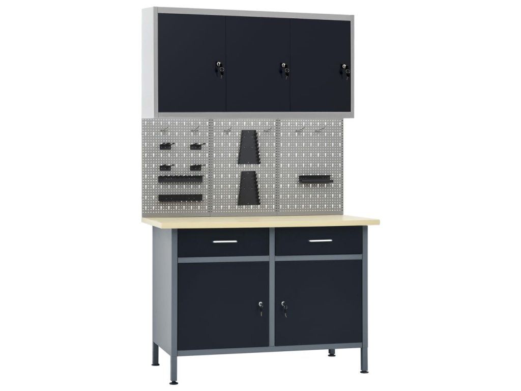 Táto sada je kombináciou 1 pracovného stola, 4 nástenných panelov a 2 nástenných skriniek, ktoré budú praktickým riešením pre vašu dielňu alebo garáž.