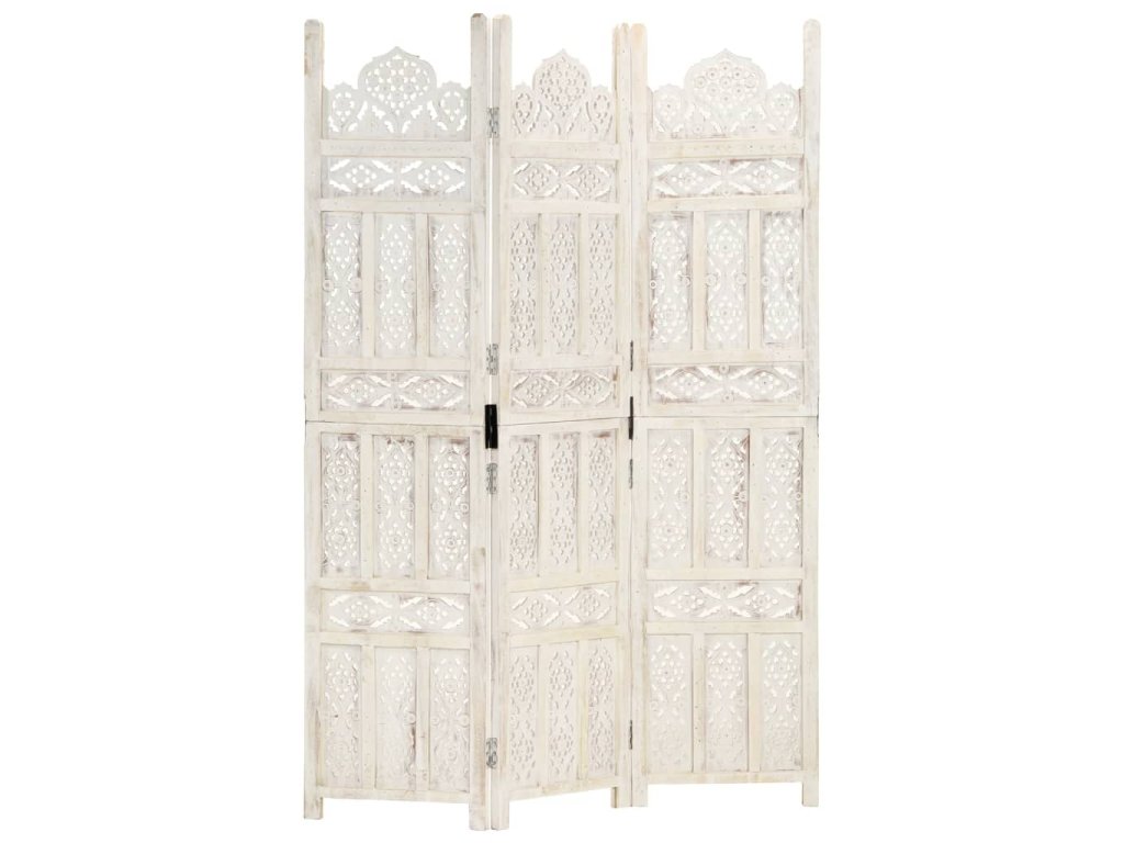 vidaXL Ručne vyrezávaný 3-panelový paraván biely 120x165 cm mangovníkový masív