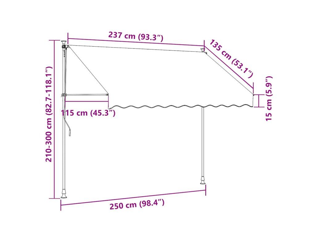 Táto markíza je vyrobená z kvalitného polyesteru s vrstvou PU, vďaka čomu odpudzuje vodu a nečistoty a je odolná voči UV žiareniu a poveternostným vplyvom. Markíza má pevný oceľový rám, takže je robustná a trvácna. Polyesterová strieška sa dá jednoducho odstrániť z rámu a očistiť. Markíza sa dá zatiahnuť pomocou ručnej kľuky. Výška aj sklon markízy sa dajú nastaviť podľa potreby. Solárne LED svetlá v noci vytvoria príjemné osvetlenie. Markíza sa jednoducho montuje.