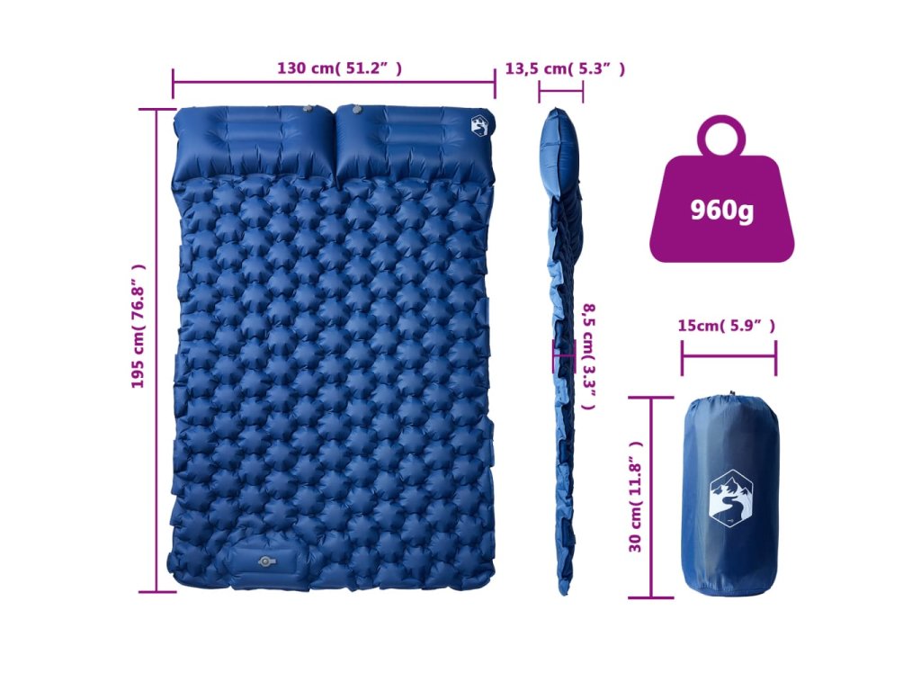 vidaXL Samonafukovací kempingový matrac s vankúšmi, 2 osoby tmavomodrý