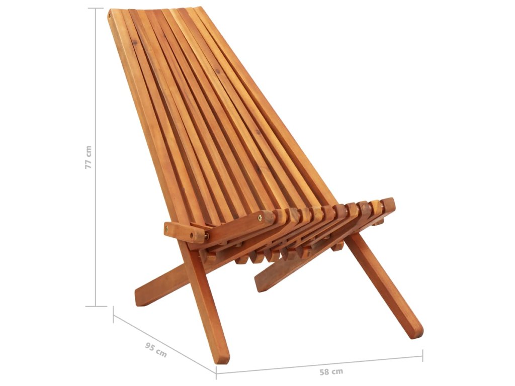 Táto stolička je vyrobená z vysokokvalitného akáciového dreva, ktoré je odolné voči poveternostným vplyvom a veľmi trvácne. Pretože je stolička vodeodolná, je vhodná pre vnútorné aj vonkajšie použitie. Bude to ideálny doplnok pre letné grilovanie na záhrade, pri táboráku, či na pláži so svojimi blízkymi alebo dokonca aj na kempingu s priateľmi a rodinou. Ergonomická sedačka s vysokým operadlom a nízkym profilom vám poskytuje extrémne pohodlie počas odpočívania s koktailom v ruke po dlhom pracovnom dni. Stolička sa dá rozložiť a zložiť, aby sa mohla premiestniť kamkoľvek vo vašom dome. Ak sa stolička nepoužíva, môže byť uložená naplocho pre rýchle a ľahké uskladnenie vo vnútri garáže alebo vonku v úložnej kôlni.