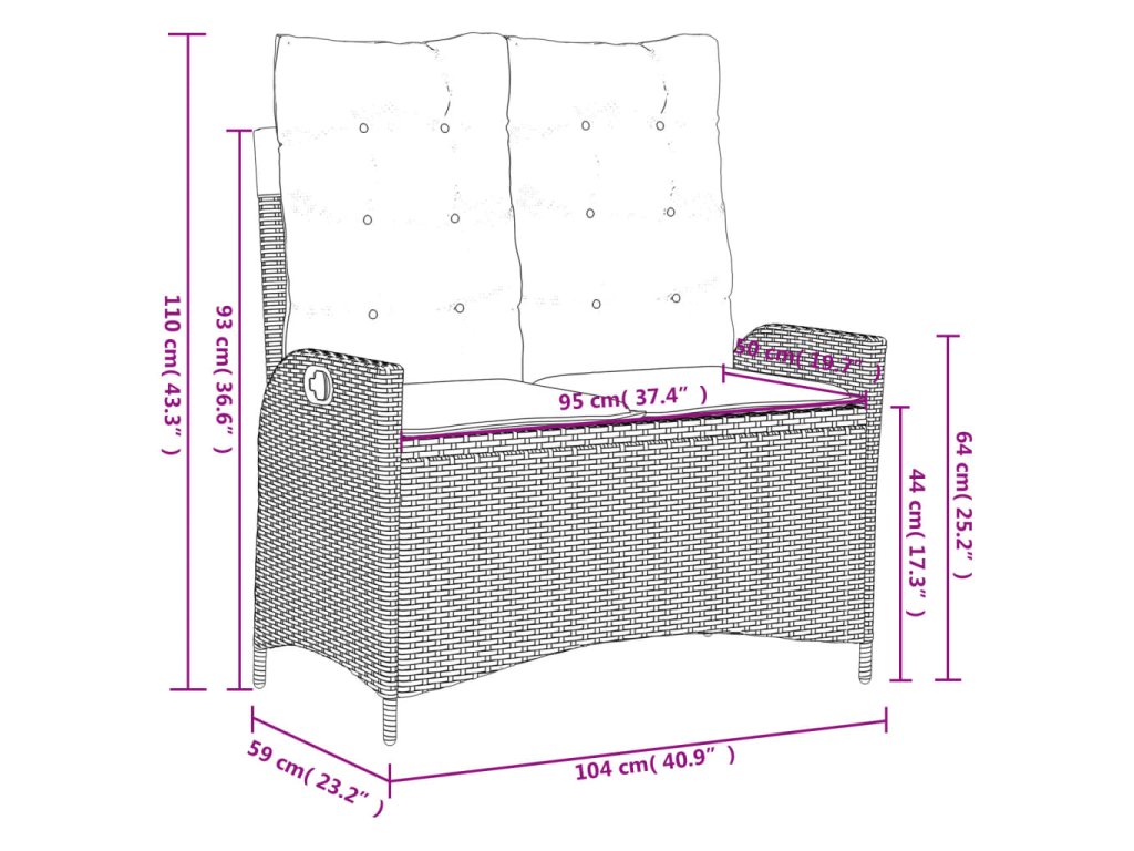 - Rozmery v polohe na sedenie: 104 x 59 x 93 cm (Š x H x V)