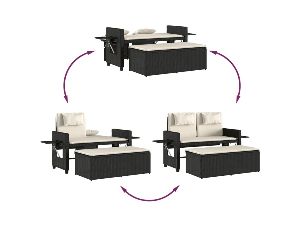 - Všestranná funkčnosť: Tento vonkajší nábytok sa dá použiť ako dvojmiestna lavica alebo rozkladacia pohovka. Jednoducho ju môžete zmeniť na posteľ sklopením operadla a vytiahnutím taburetky spod lavice. Podporné panely za operadlami zvyšujú stabilitu postele.