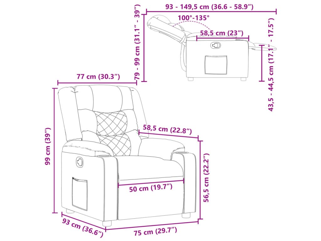 - Rozmery v polohe na ležanie: 77 x 149,5 x 79 cm (Š x H x V)