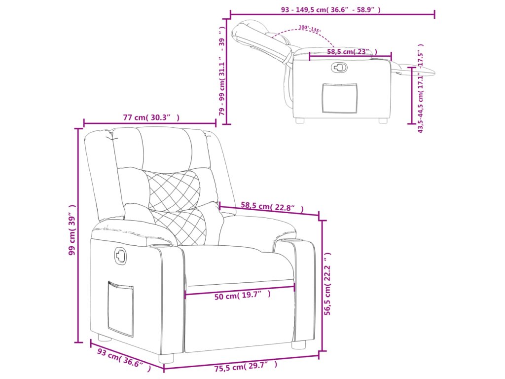 - Rozmery v polohe na ležanie: 77 x 149,5 x 79 cm (Š x H x V)