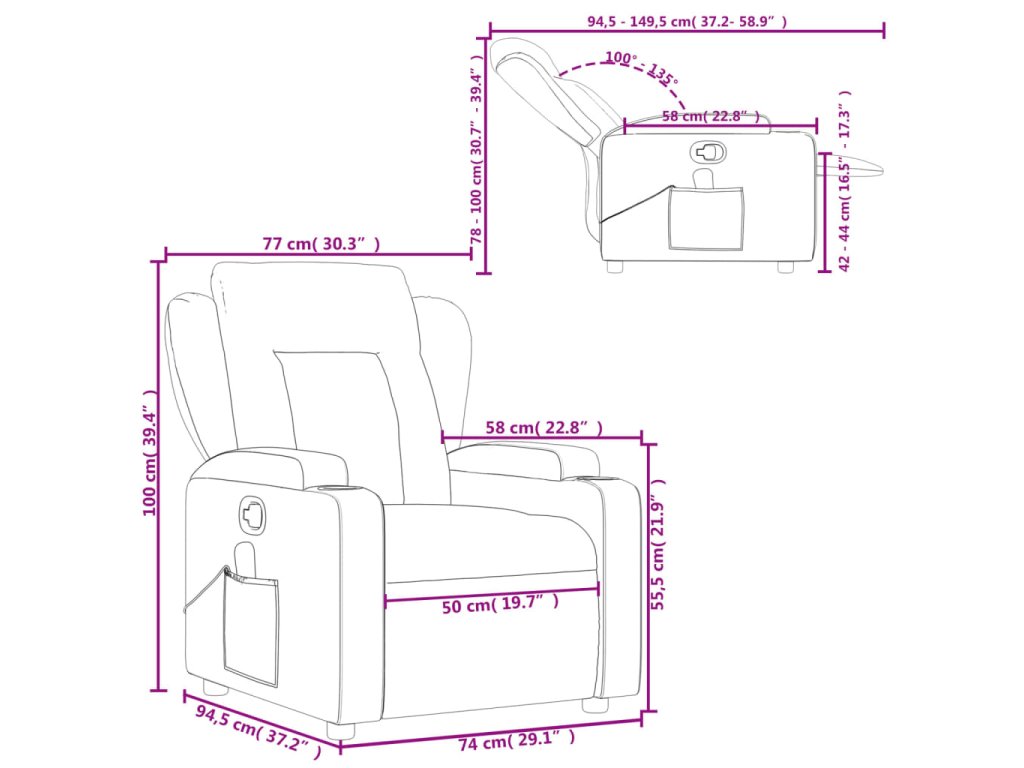 - Pohodlné držiaky na poháre a bočné vrecko: Toto kreslo má dva praktické držiaky na nápoje a bočné vrecko na diaľkový ovládač alebo na dôležité veci, ktoré budete mať po ruke.