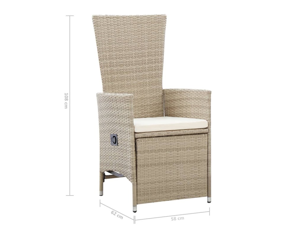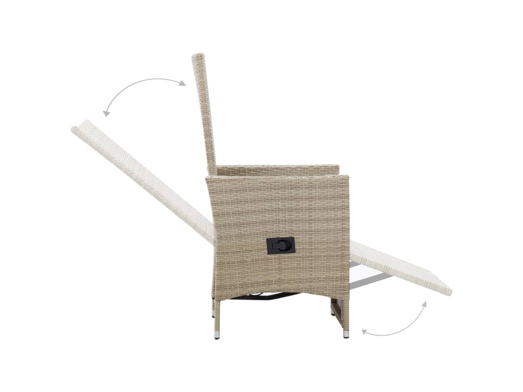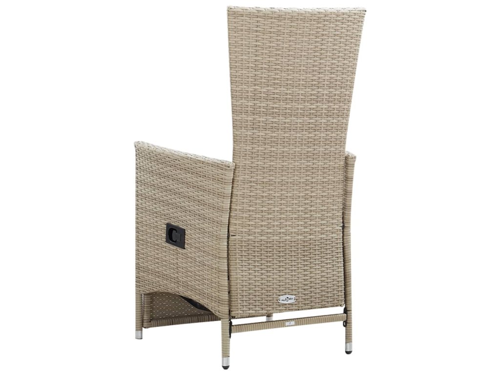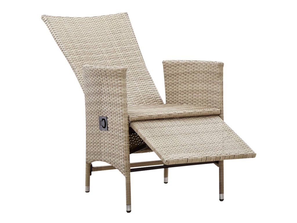 Vonkajšie sedenie je vyrobené z vodeodolného PE ratanu, ktorý je odolný voči poveternostným vplyvom, ľahko sa čistí, je odolný voči opotrebovaniu a vhodný na každodenné použitie. Vďaka oceľovým rámom s práškovým povrchom sú pevné a odolné. Lakťové opierky sú vyrobené z akáciového dreva, tropického tvrdého dreva, ktoré im prináša rustikálne kúzlo. Dotknutím sa tlačidla na boku sa operadlo sklopí a súčasne sa pohne aj opierka, čím dosiahnete polohu vhodnú na ležanie. Vďaka ľahkej konštrukcii sa záhradné kreslá jednoducho presúvajú.