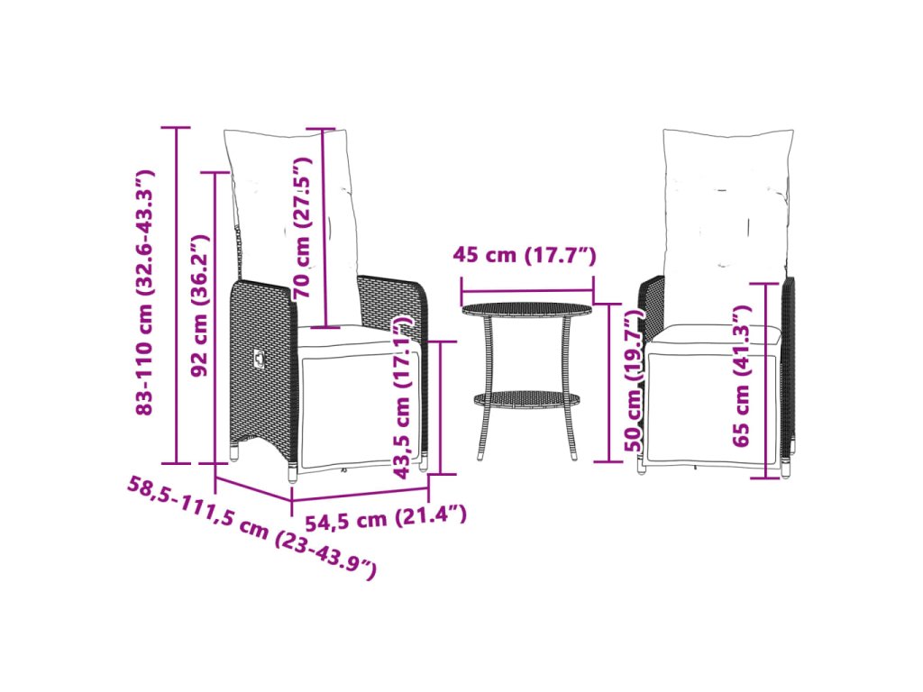 - Rozmery v polohe na ležanie: 54,5 x 111,5 x 83 cm (Š x H x V)