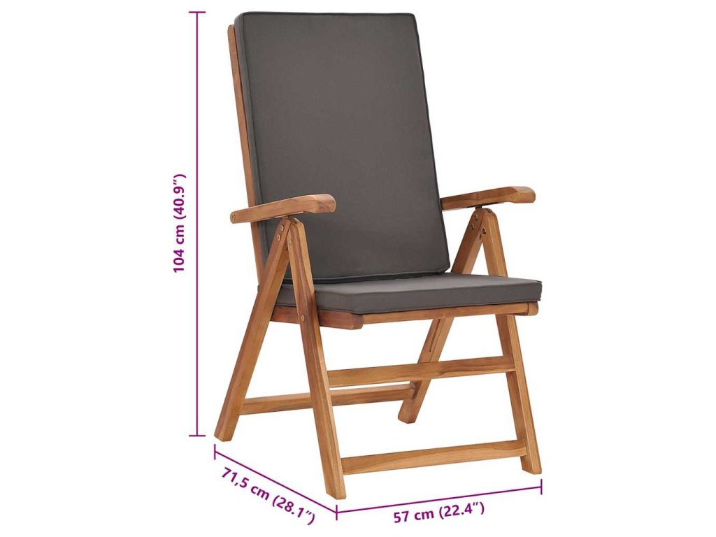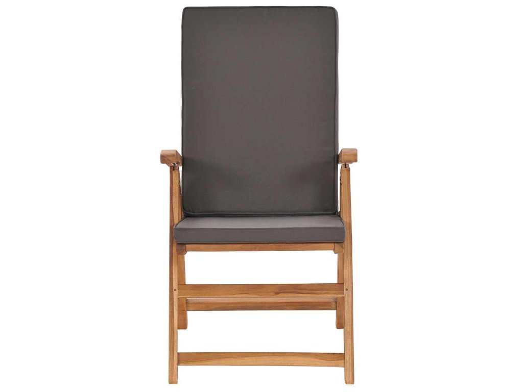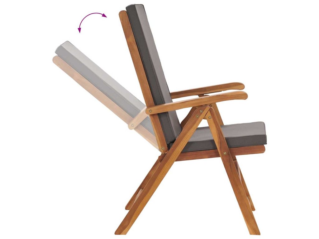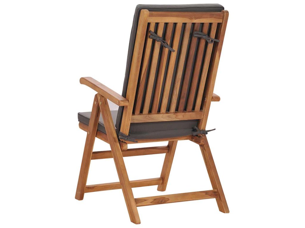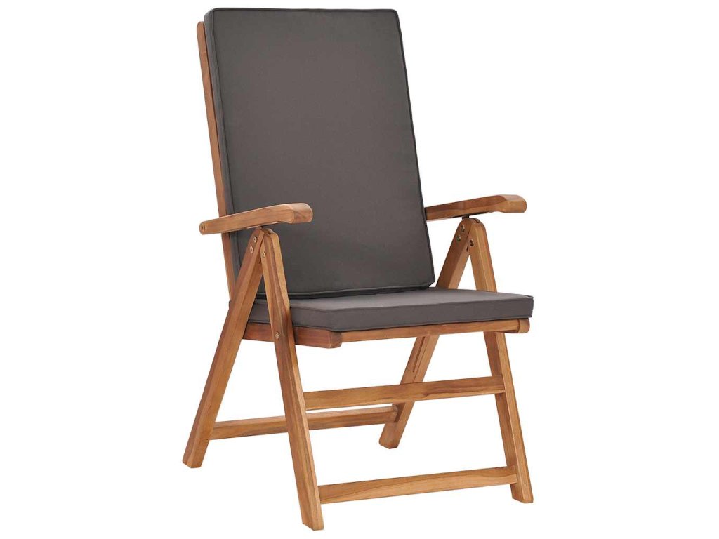Tíkový nábytok je vyhotovený z mimoriadne trvácneho tvrdého tíkového dreva, ktoré bolo umelo vysušené v sušiarni a jeho povrch bol následne jemne obrúsený, aby získal hladký vzhľad. Tíkové drevo sa vyznačuje výnimočnou pevnosťou a odolnosťou voči poveternostným vplyvom, a tak predstavuje jeden z najvhodnejších materiálov na výrobu záhradného nábytku spomedzi všetkých ostatných druhov dreva. Ak si chcete zaobstarať záhradný nábytok, ktorý vám bude slúžiť dlhé roky, tíkové drevo je pre vás ako stvorené. Extra hrubé a odolné tíkové drevo zabezpečuje vynikajúcu stabilitu. Sedadlo s latkovým dizajnom a zaoblené opierky a operadlo poskytujú komfort pri sedení. Operadlo sa dá nastaviť do 5 úrovní, a tak si vždy budete môcť nájsť tú najpohodlnejšiu polohu. Podložky na sedadlo a operadlo s hustou výplňou prinášajú maximálne pohodlie. Odnímateľný poťah sa dá v prípade potreby oprať. Keď stoličku nepoužívate, stači ju jednoducho sklopiť, aby nezaberala veľa miesta.