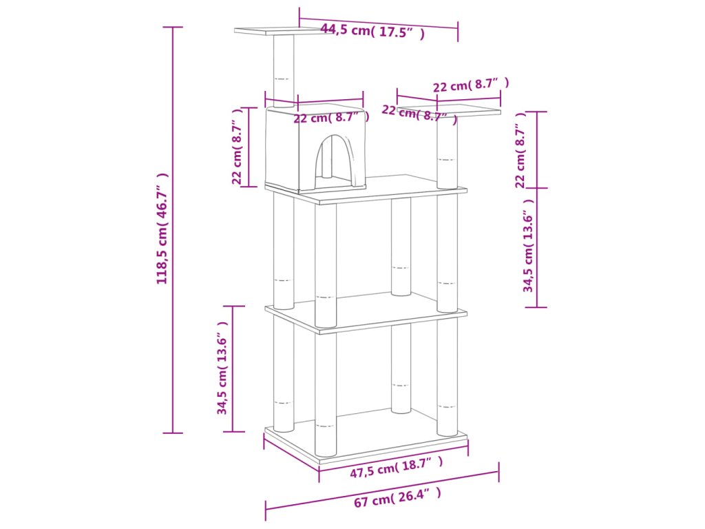 Vaši chlpatí priatelia si môžu ostriť pazúriky na škrabacích stĺpikoch obalených sisalovým lanom, ktoré im poskytnú zdravý spôsob ako si tento svoj inštinkt trénovať. Budú sa veselo naháňať a skákať hore dole po strome. Keď sa vašim malým kamarátom prestane chcieť hrať, zaiste si radi oddýchnu na plošinách v hornej časti, odkiaľ majú lepší výhľad. Alebo sa môžu schovať do útulného domčeka a pospať si či len tak odpočívať na pohodlnom plyšovom sedadle.