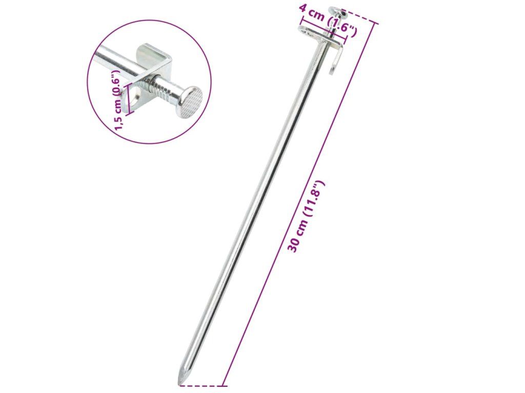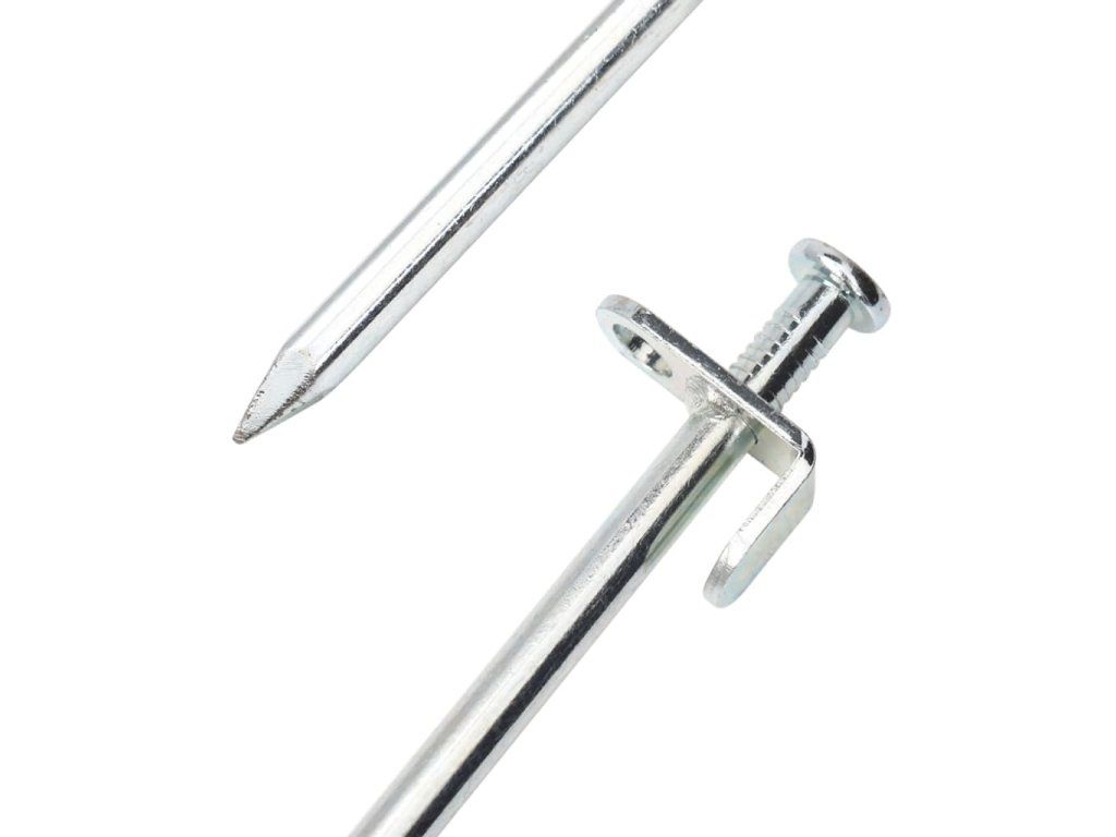 - Dva spôsoby zabezpečenia: Hlava kolíka je vybavená háčikom a očkom, čo umožňuje ľahké upevnenie. Táto konštrukcia zaručuje, že stany, pavilóny a markízy zostanú bezpečne ukotvené aj vo veternom počasí.