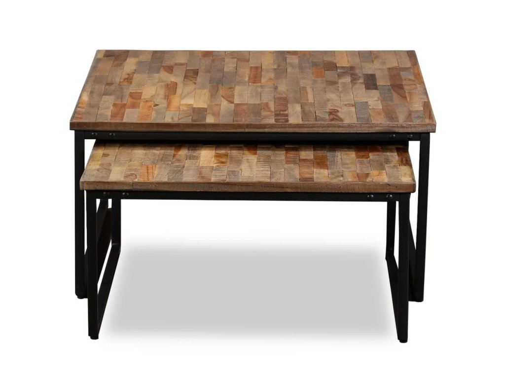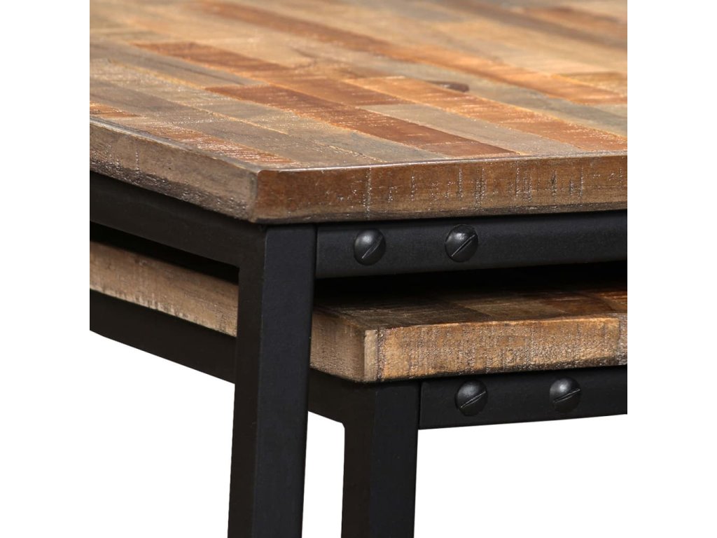 Štýlová súprava konferenčných stolíkov v industriálnom štýle predstavuje nadčasový doplnok do každej domácnosti. Vrchná doska z masívneho dreva poskytuje stabilné a bezpečné miesto na odkladanie nápojov, váz, misiek s ovocím alebo rôznych ozdôb. Konferenčné stolíky môžete používať aj ako bočné stolíky.